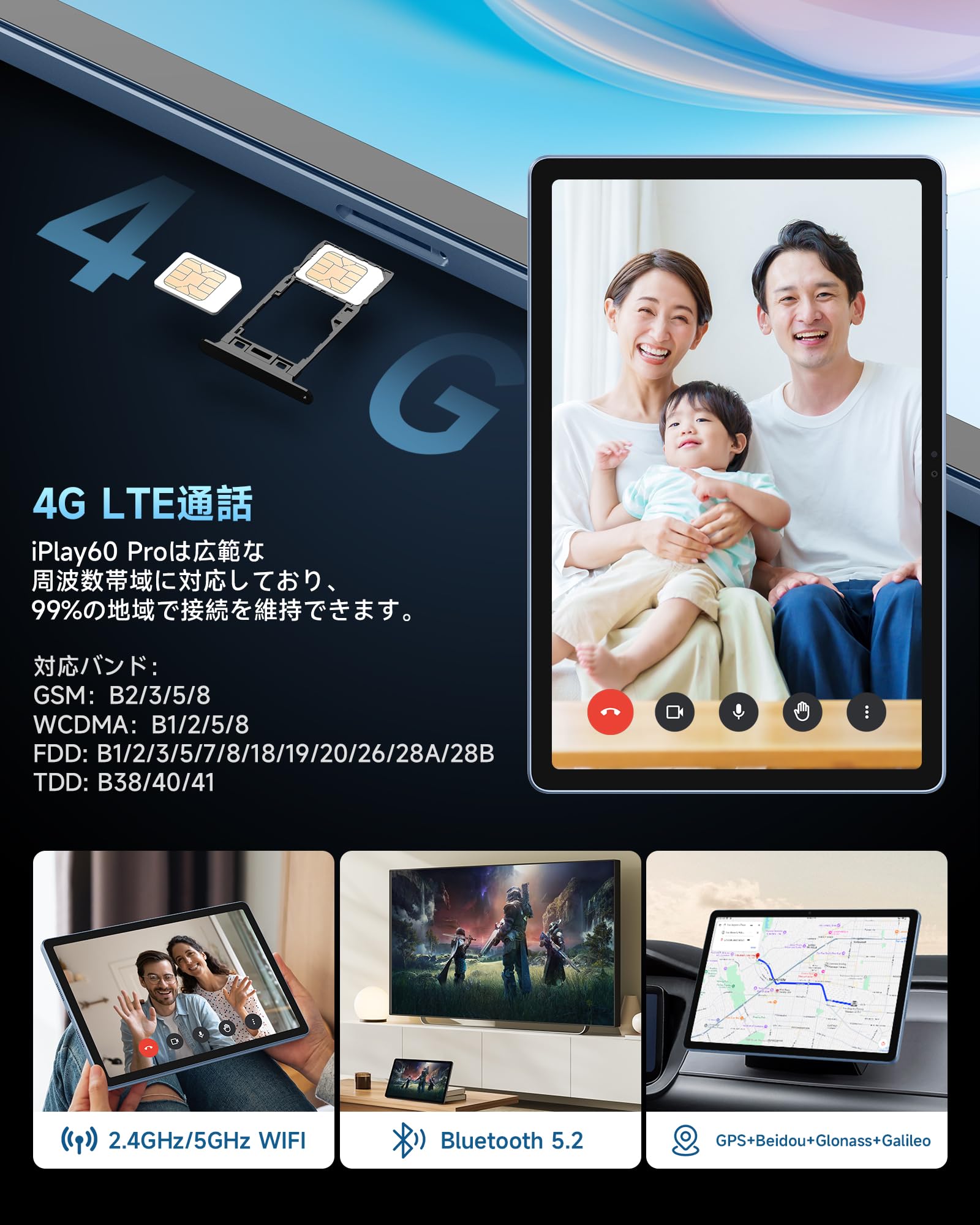 【ナビゲーション機能、4G LTE、5MPデュアルカメラ、BT5.2、WiFi5】 インカメラとアウトカメラはどちらも5MPで、Google レンズがプリインストールされており、簡単にスキャンして検索ができます。これで、どこでもタブレットの楽しさを存分にお楽しみいただけます。Bluetooth 5.2とデュアルバンドWi-Fi 802.11a/b/g/n/ac(2.4GHz + 5GHz)をサポートしており、高速で安定したネットワーク接続を提供します。また、4G LTE機能も搭載しています。重力センサーと光センサーが内蔵されており、Beidou、Galileo、Glonass、GPSを利用したナビゲーションをサポートし、よりスマートな移動を実現します。1年間のがついているので、安心してご使用いただけます。