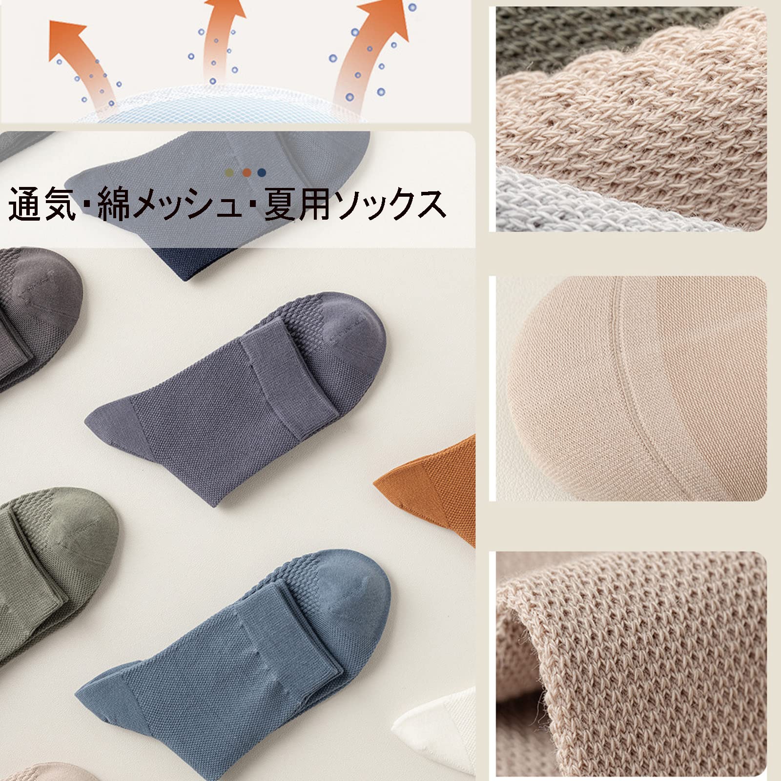 【メッシュ靴下 メンズ 24-27cm 5足セット】:【素材】:91%綿 +ボリエステル【サイズ】:靴下 メンズ 24-27cm 【生地】:薄め綿 〇品質の高い綿素材を使い、通気性、吸湿性、伸縮性とも性能が高く、コスパがよい夏用 メッシュソックス メンズ。季節問わない素材を利用し、汗をかきやすい方におすすめの吸湿性の高いメンズ メッシュ靴下。