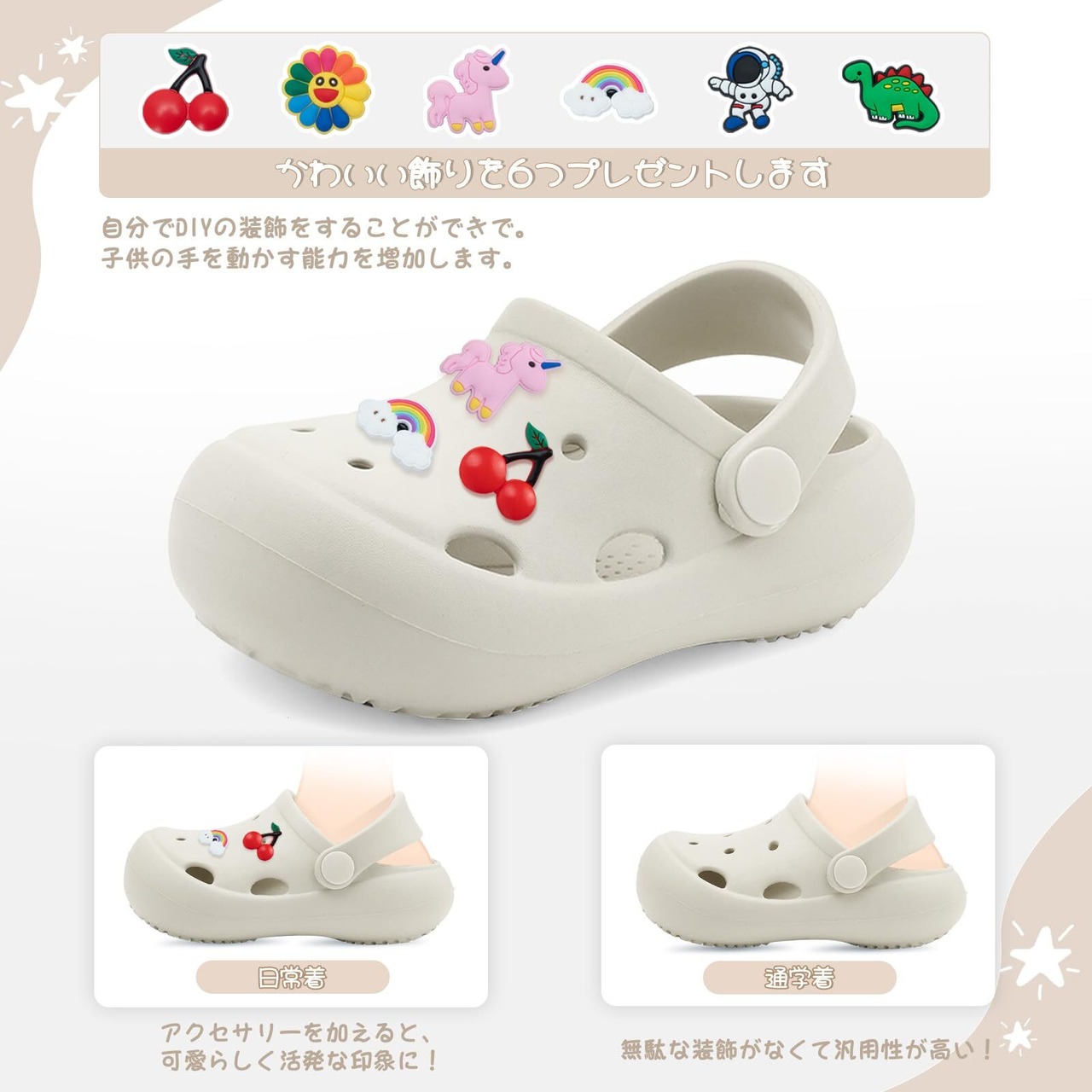 着脱簡単:ストラップを調整でき、子供用スリッパや子供用サンダルとしてご利用いただけます。自分でDIYの装飾をすることができて、子供の手を動かす能力を増加します。かわいい飾りを6つプレゼントします:恐竜、ユニコーン、宇宙飛行士、レインボー、チェリー、ひまわりなどです。