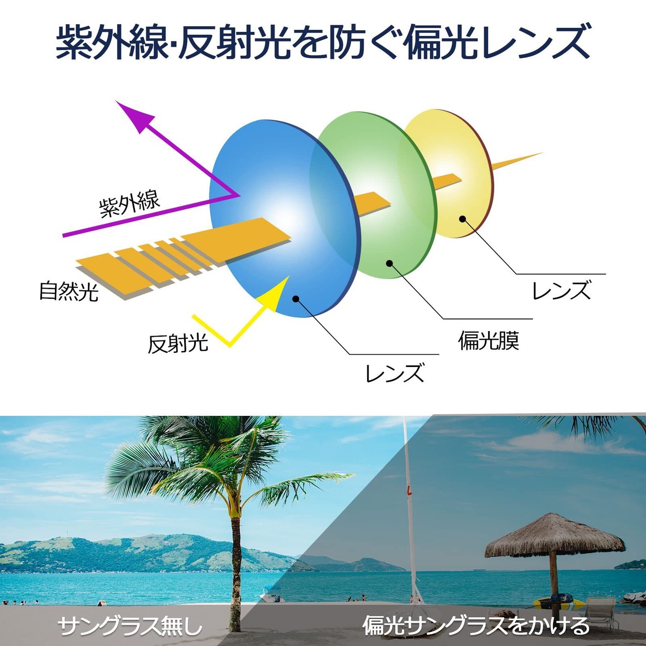 【TAC偏光レンズ】表面に特殊な9層も重ねてコーティング技術加工しています、有害な光や、乱反射な光を100%カットして,強い日差しから目を守ってくれます。視界を鮮明に保ちますTAC偏光トリアセテートレンズは、耐衝撃性、軽量性、耐久性が優れて、長く使えまられ。
