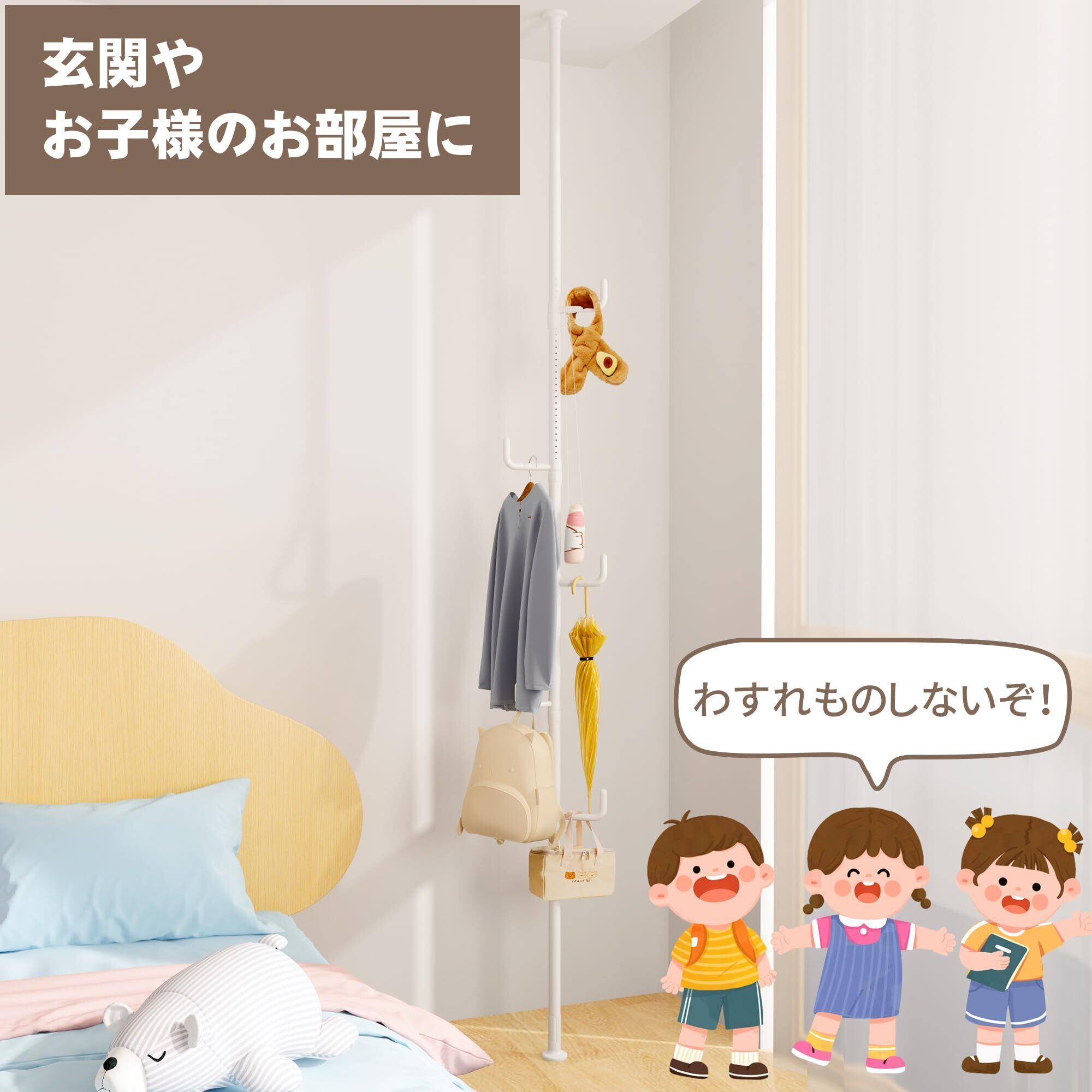 【便利な6つのフック付】このハンガーラック 突っ張りは、便利な6つのフックが付いています。高さや角度を自在に調節できるため、お好みの場所に簡単に設置できます。特に玄関に置いて使用すれば、外出に使うコート、バッグや帽子などをスマートにかけることができます。わずか18㎝ほどのスペースさえあれば設置可能で、玄関やリビング入口、お部屋のコーナーなどの限られたスペースを有効に活用できます。耐荷重も優れており、全体で約90kg、1本のフックあたり約15kgまでの荷重に耐えます。頑丈で実用的なハンガーラック 突っ張りをぜひお試しください。