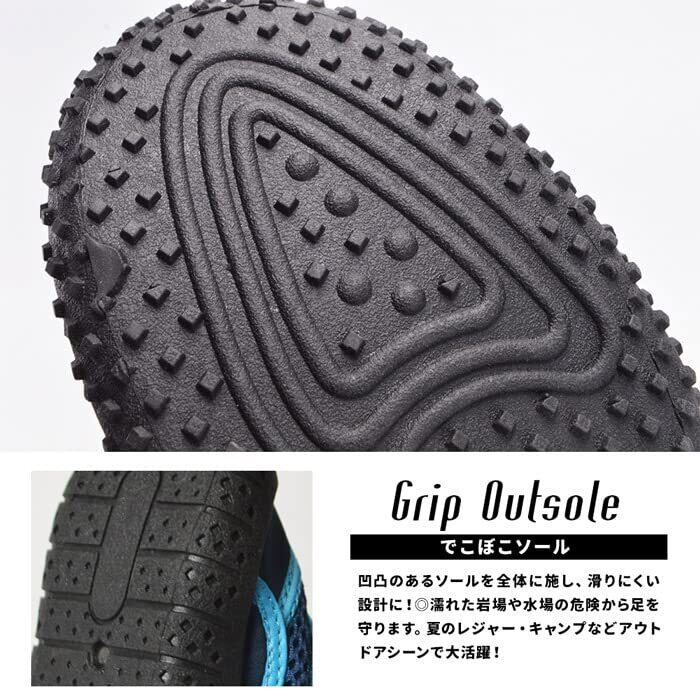 ソールはグリップ力があり岩場でも滑りにくいので、岩場などでの遊びや潮干等のレジャーにオススメです。