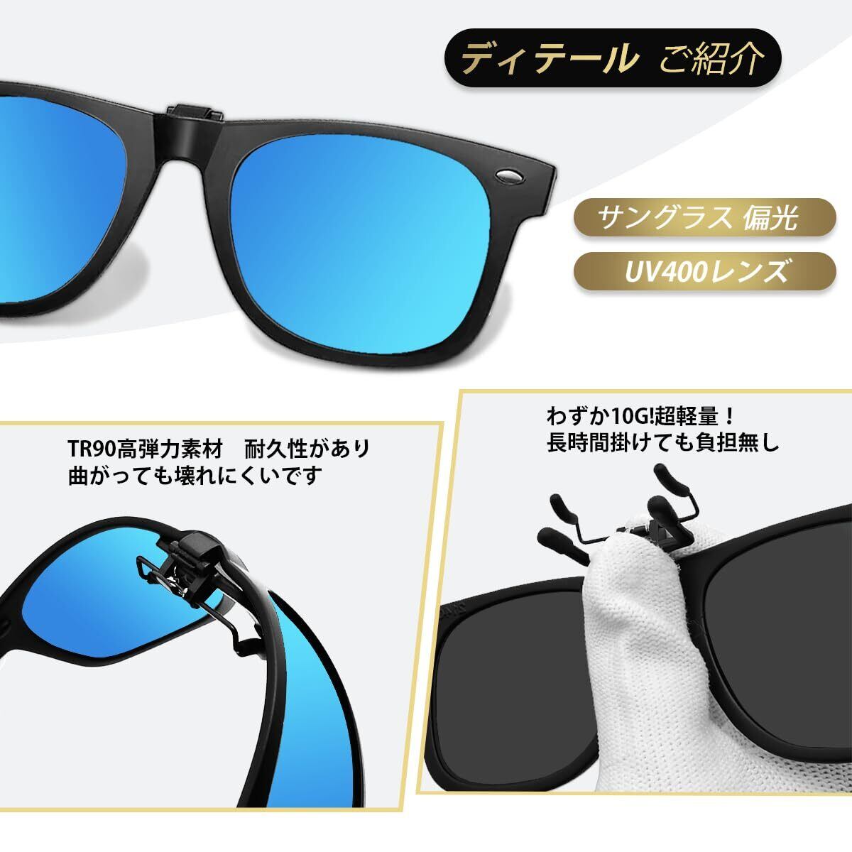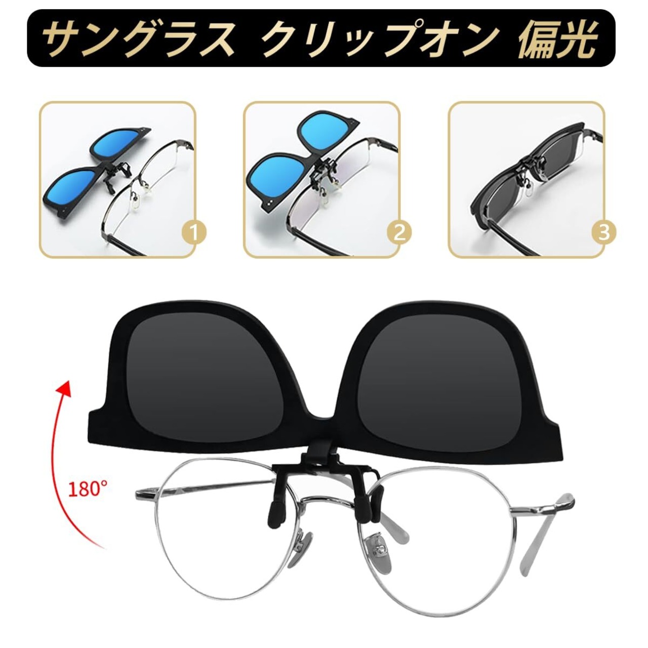 【眼鏡着用者ためのサングラス】:クリップをメガネに挟んで、メガネに装着後もサングラス部分を跳ね上げする事ができます。メガネの上から付けられるUVカットのクリップ式サングラスです。ほとんどのメガネに適しています。
