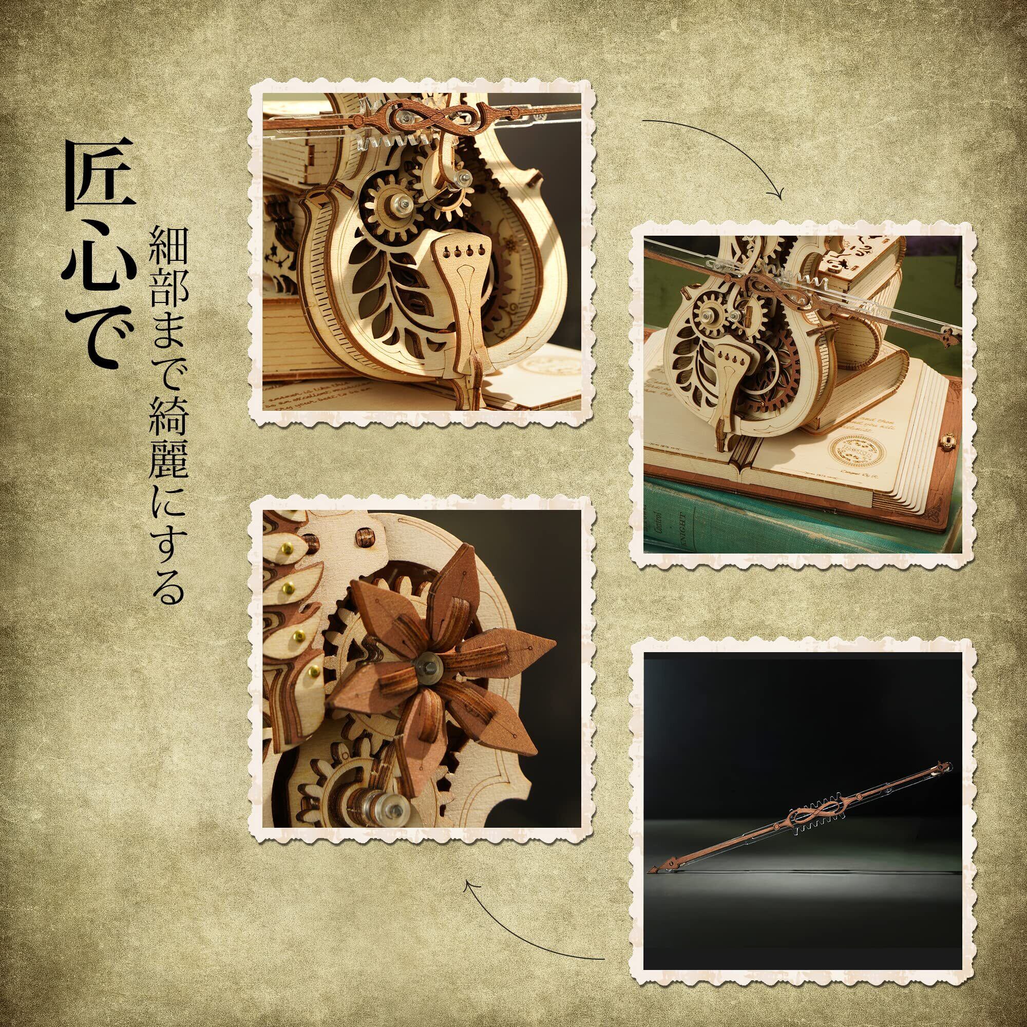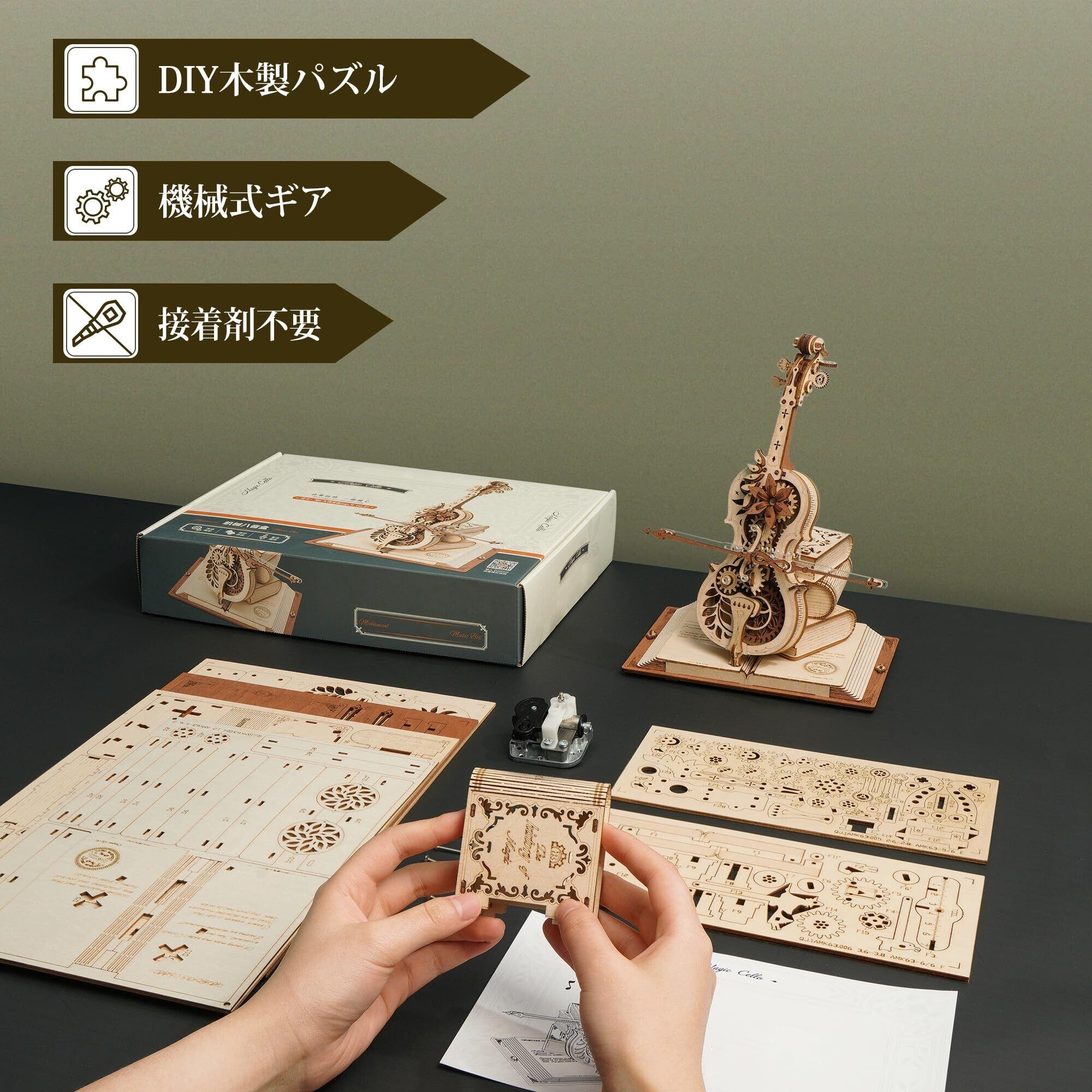 【ROBOTIME 3Dウッドパズル】機械式オルゴールシリーズの最新の3Dパズルです。このホビーキットはチェロを「機械式オルゴール」として取り入れており、魔法が始まります。約5時間の組み立て作業で、ゼンマイを巻き上げると、弓が動き始め、ショパンの音楽が流れます。精巧なデザインと細部へのこだわりが、この立体パズルを特別なものにしています。