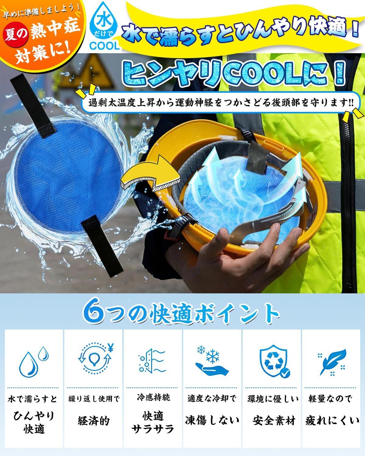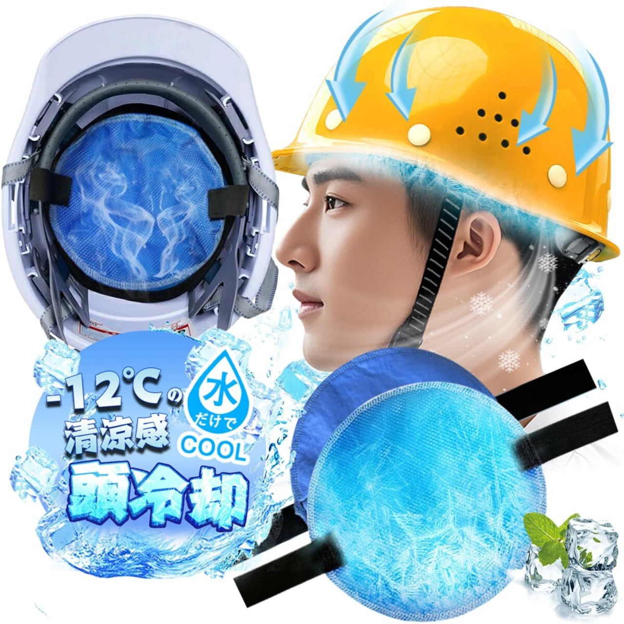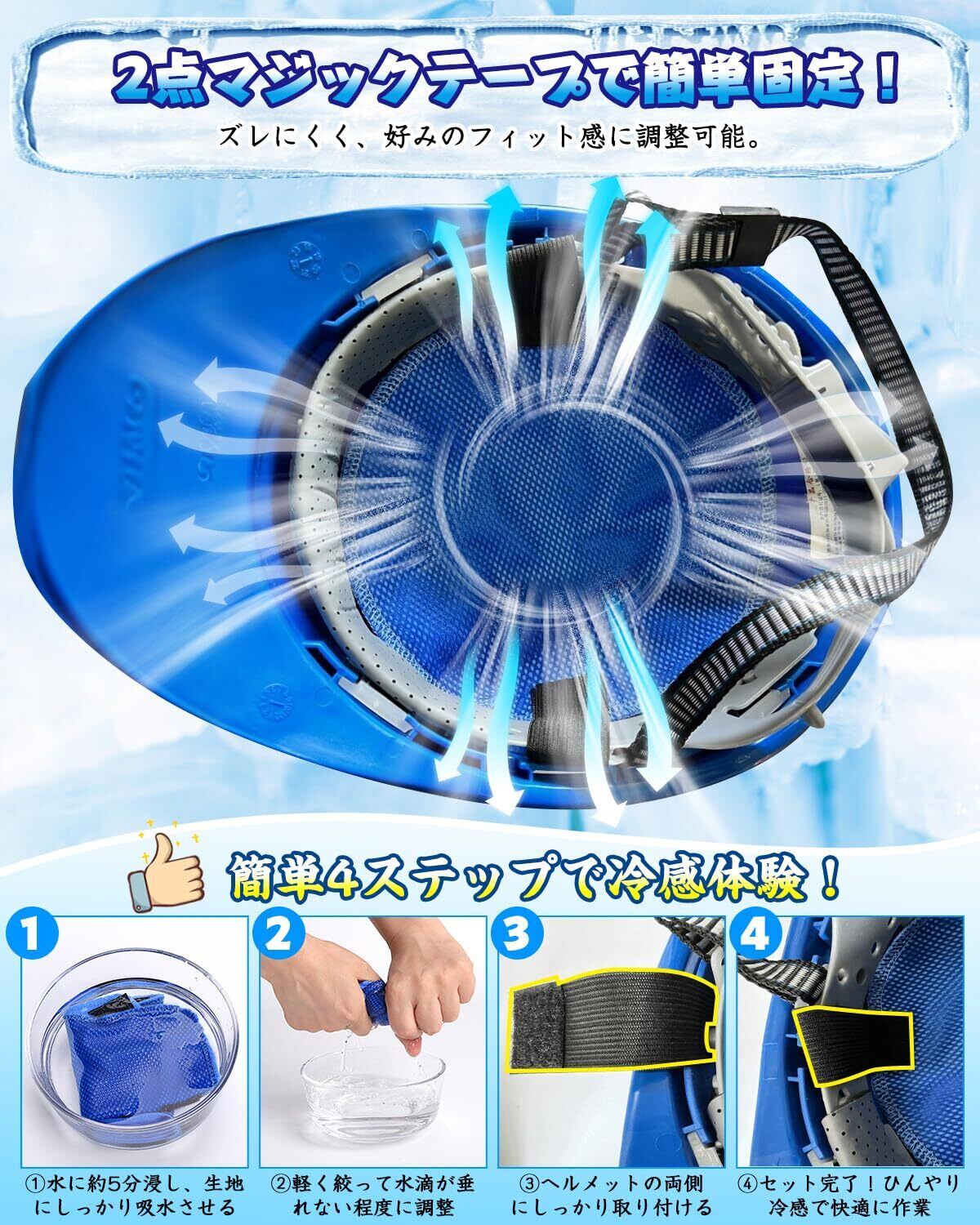 【水だけでひんやり!暑さ対策&熱中症予防】※ご注意:商品は輸送ダメージ防止のため、やや湿った状態で届く場合がありますのでご承知おきください。「頭が暑くて集中できない…」そんなあなたに!水に浸して絞るだけ、電気も保冷剤も不要の「2025年新登場・ヘルメット冷感インナー」が登場!高吸水PVA素材が気化熱を利用して、頭部をやさしく冷却。約5分の簡単準備で、ひんやり感が長時間持続します。 ヘルメットや帽子の内側に装着するだけで、現場作業中も快適なヘッドクールを実現! 通勤、屋外作業、アウトドアまで幅広く活躍する、夏の必須アイテムです。