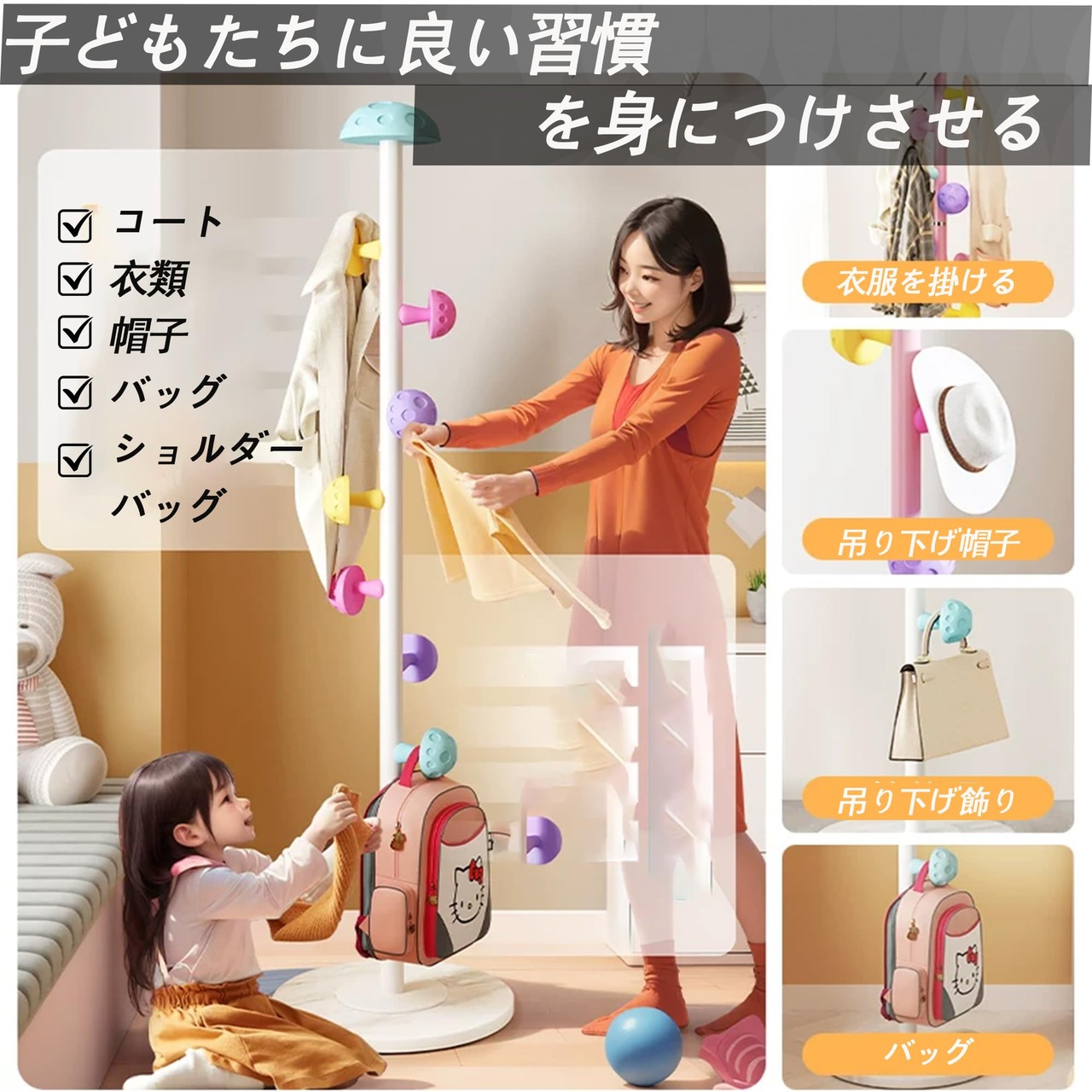 1.製品仕様:ポールハンガー 直径30cm×高さ167cm。枝数:7。材質:鉄。鉄は防水性があり、カビが生えにくいです。全体で30kgの耐荷重があります。子どもたちの実践能力を刺激し、良い習慣を養います。