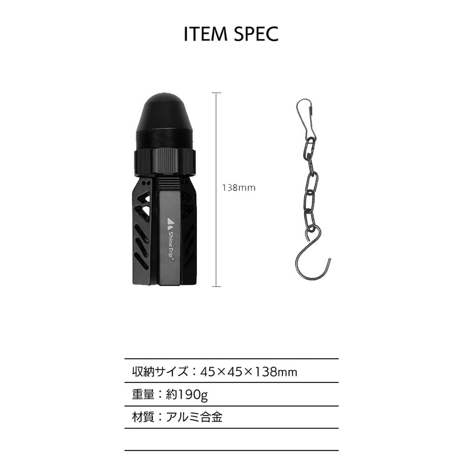 【製品仕様】高品質なアルミニウム合金製で、耐久性・耐風性に優れた設計。サイズ:(約)4.5cm×4.5cm×13.8cm、重量:(約)190g。コンパクトで持ち運びやすく、フックも付属しています。