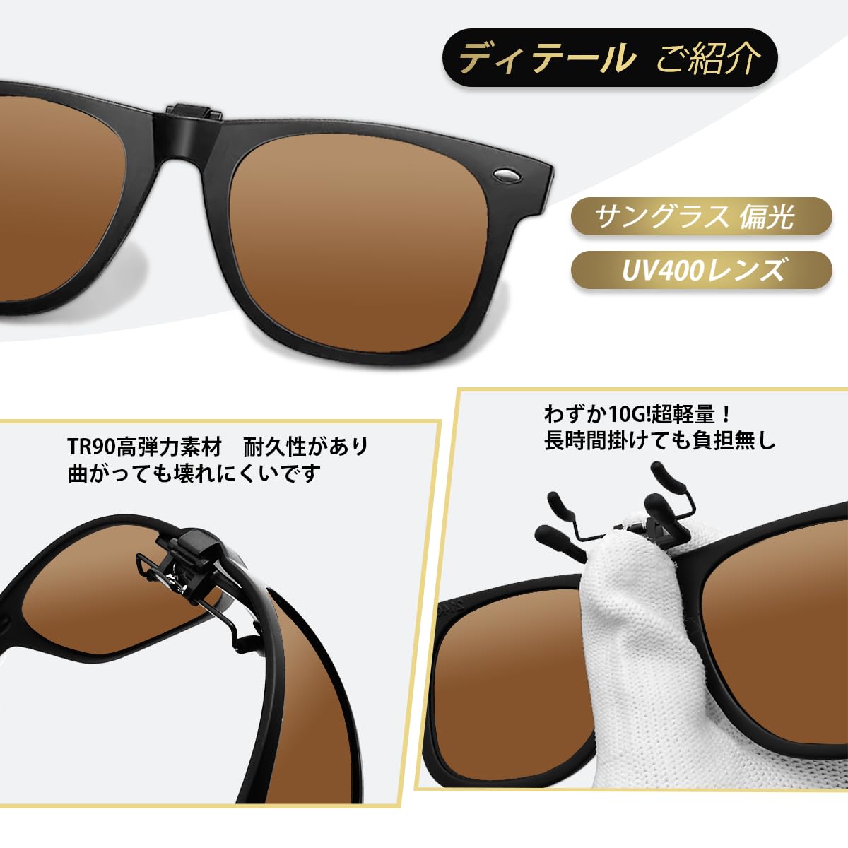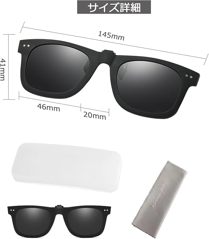 【眼鏡着用者ためのサングラス】:クリップをメガネに挟んで、メガネに装着後もサングラス部分を跳ね上げする事ができます。メガネの上から付けられるUVカットのクリップ式サングラスです。ほとんどのメガネに適しています。