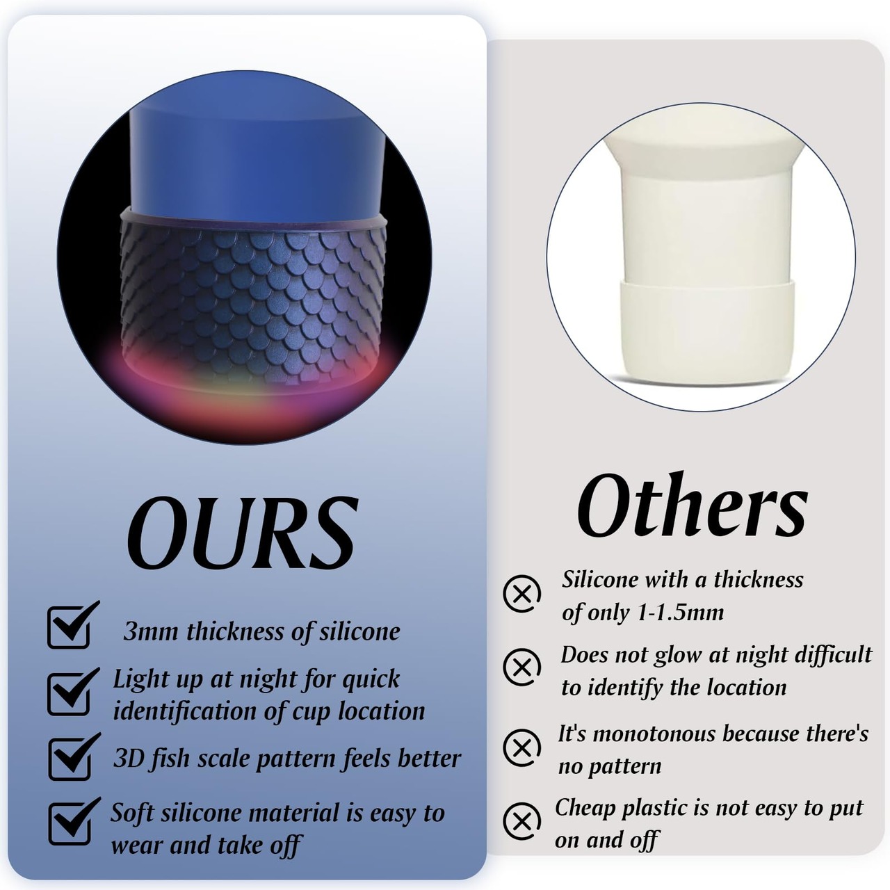【強化保護】: シリコンブーツは、水筒やタンブラーの底を損傷や傷から保護し、やけどを防ぎ、長持ちする耐久性を確保します。スリーブはボトルの底に安定したグリップを提供し、テーブルに置いたときの音を減らします。
