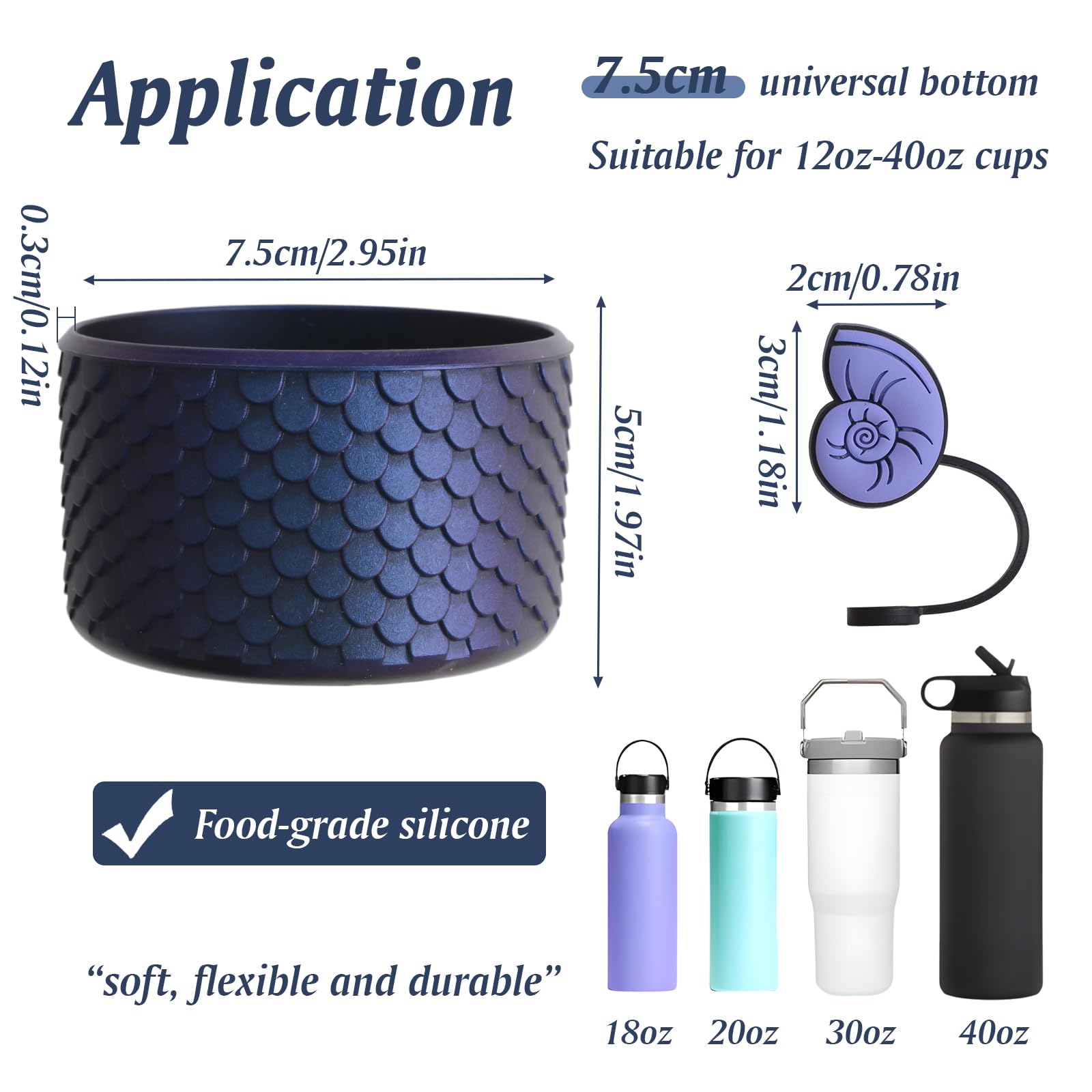 カップソール保護ブーツのサイズは75*50mm/2.95*1.97in、厚さは3mmで、12-40ozのカップに適しています。コンク貝ストロー栓は3*2cm/1.18*0.78inで、直径10mmのストローに適しています。購入前に水筒のサイズを確認してください。