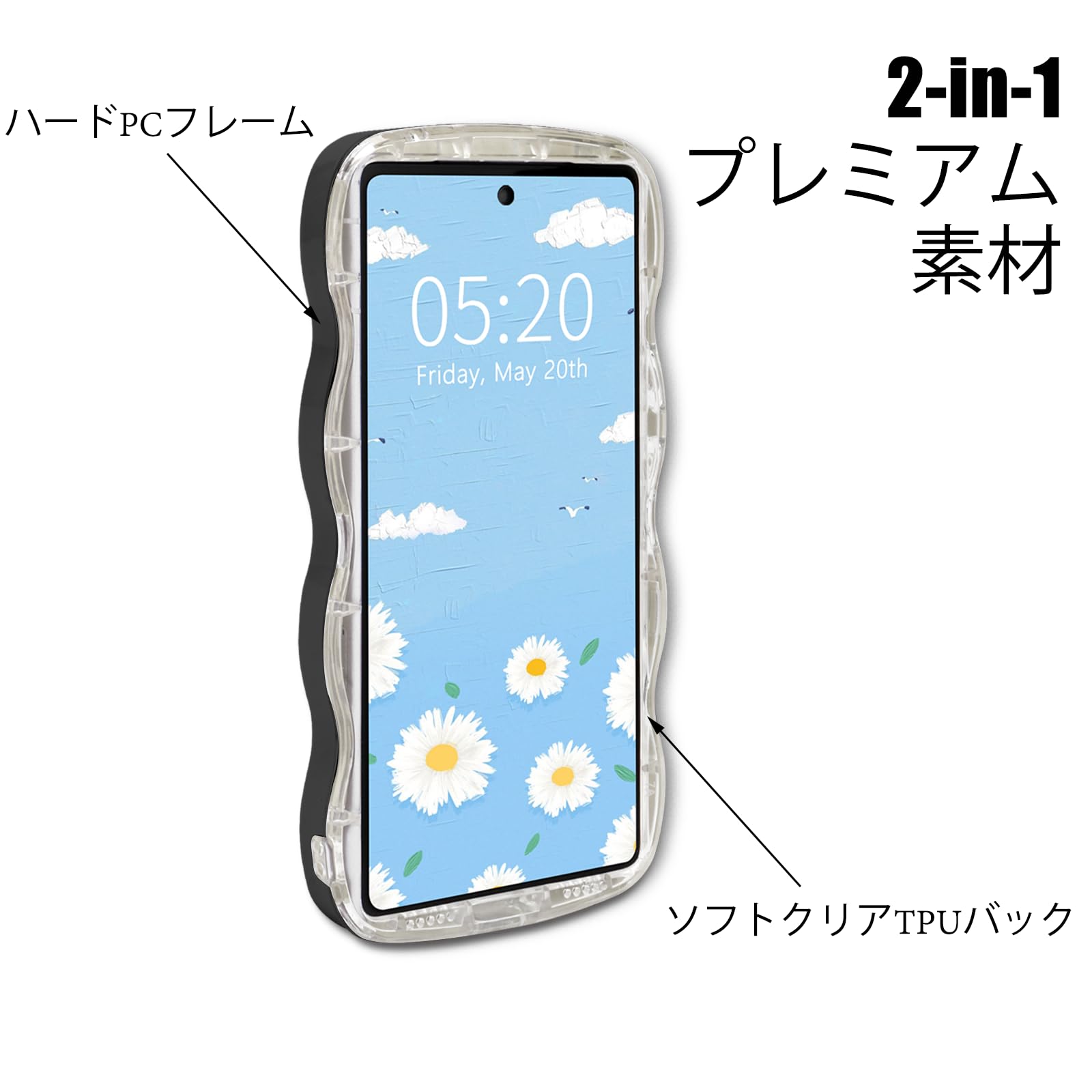 【2in1特別なデザインです&着脱簡単】2in1はサイド周りのウェーブ部分はプラスチック素材で取り外し可能です。 キャンディカラーの波状のエッジは、透明な ソフトTPU部分から分離することができます。取り外しも簡単,お手入れし易い。