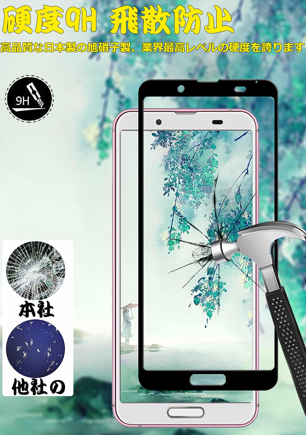 【強化ガラス】9Hの硬度を持っている強化ガラスにより、スクリーンを保護を与え、鍵やカッターなどの鋭いものにキズと割れから守ります。