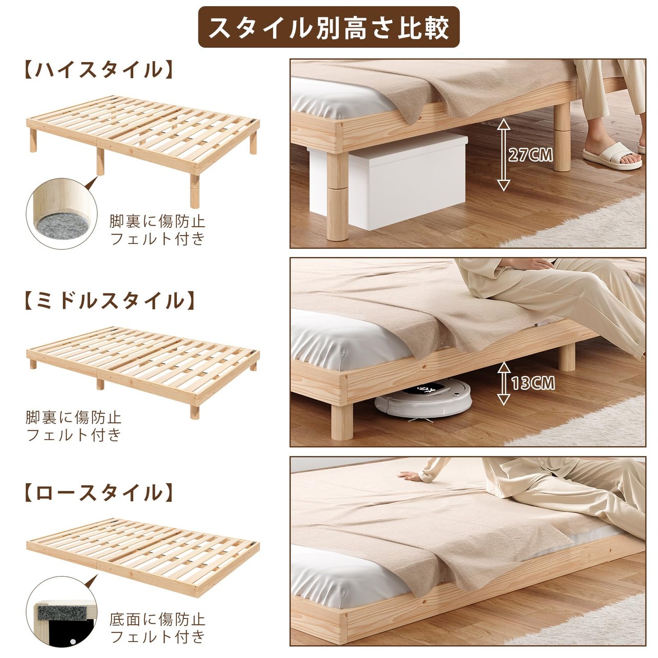【高さ3段階調整機能】ベッドの高さは部屋のスタイルに合わせて3段階で調整できます。フレームの脚部は北欧無垢パインを使用しており、ベッド全体をしっかりと支えます。また、ベッド本体と脚部には傷防止フェルトが取り付けられており、床を傷つけることなく保護します。