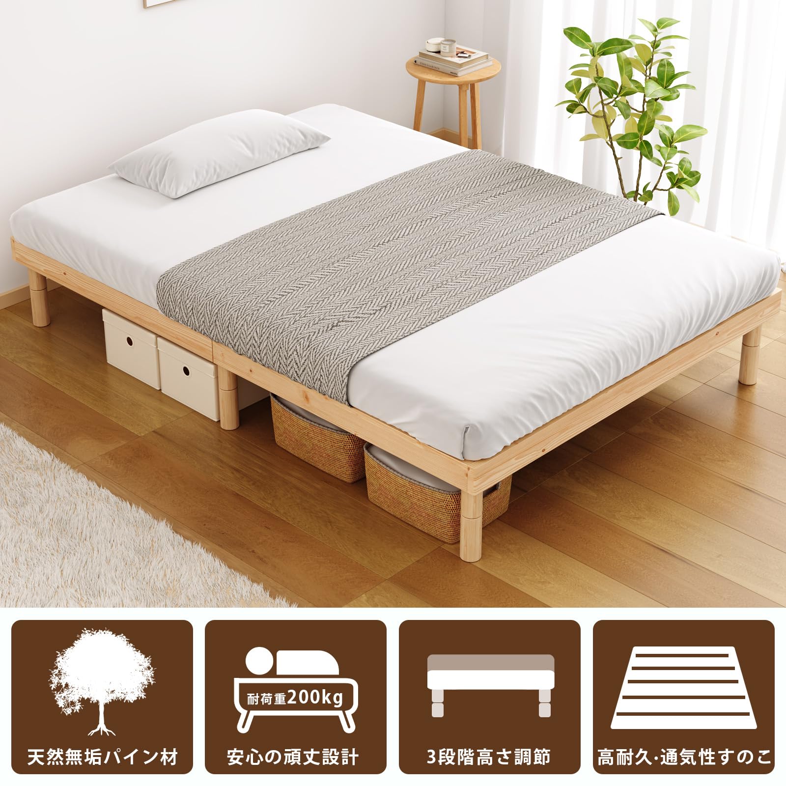 [SuperKois] ベッド ベッドフレーム シングル すのこベッド シングルベッド ベット 天然無垢パイン 3段階高さ調節 頑丈 耐荷重200kg 静音 天然木 湿気対策 ローベッド ナチュラル
