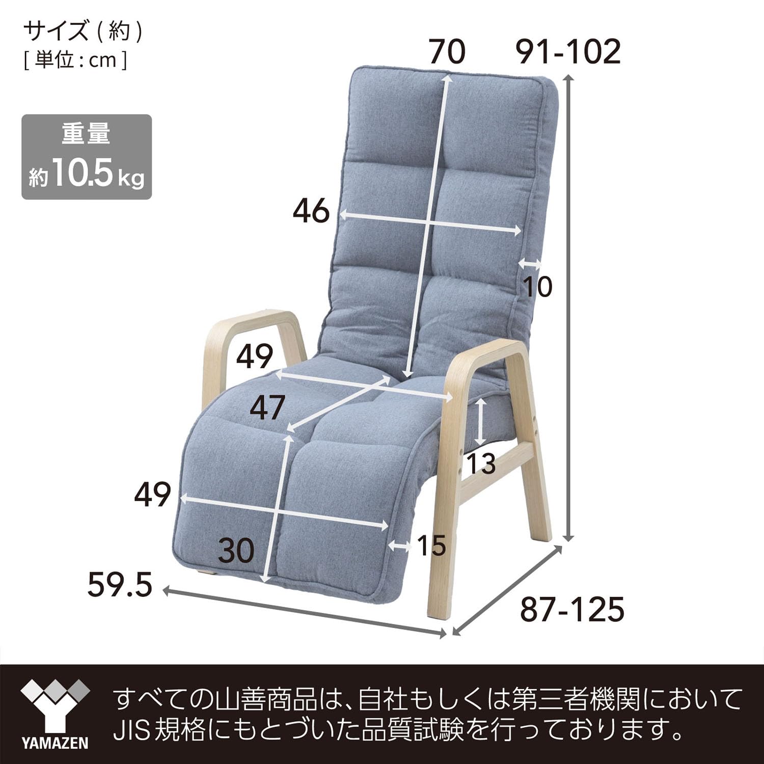 ●本体サイズ:幅59.5×奥行87-125(最小87/最大125)×高さ91-102cm(最小91㎝/最大102cm)●折りたたみ時サイズ : 幅59.5×奥行76.5×高さ53.5cm●座部の高さ : 37.5cm●背部サイズ : 幅46×高さ70㎝、厚み10cm●座面サイズ : 49×47㎝、厚み13cm●オットマンサイズ : 30×49cm 厚み15cm●構造部材 : 座部・背部/金属(スチール)、脚部/積層材●表面加工 : 脚部/ウレタン樹脂塗装●張り材 : ポリエステル●クッション材 : ウレタンフォーム●東証プライム(株)山善で扱うすべての山善商品は、自社もしくは第三者機関において、JIS規格に基づいた品質試験を行っております。