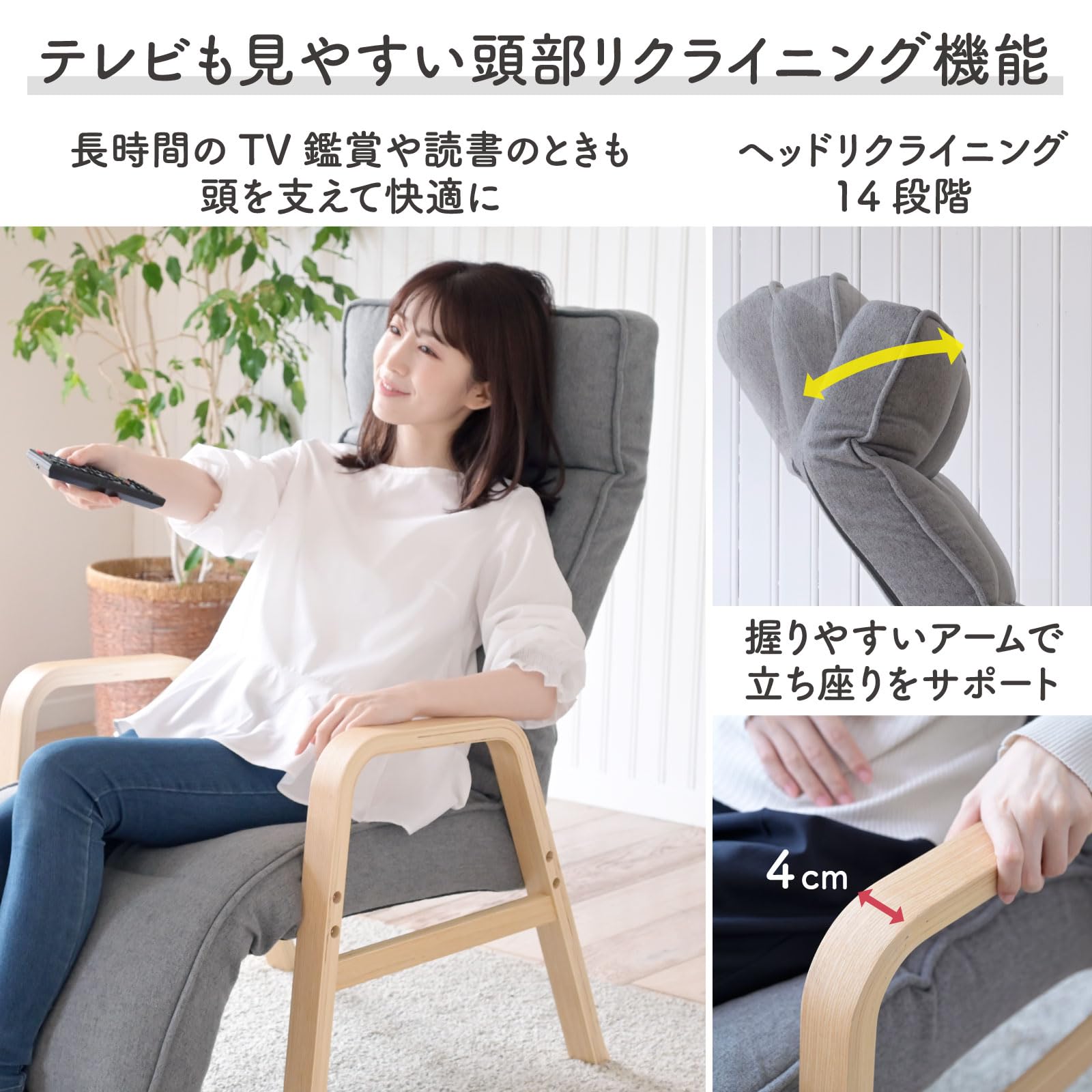 【ゆったり頭を預けられるハイバック】ヘッドは14段階で角度が変えられるので、読書やテレビを見る、または、うたた寝したいときなどシーンに合わせて細かく調整できます。