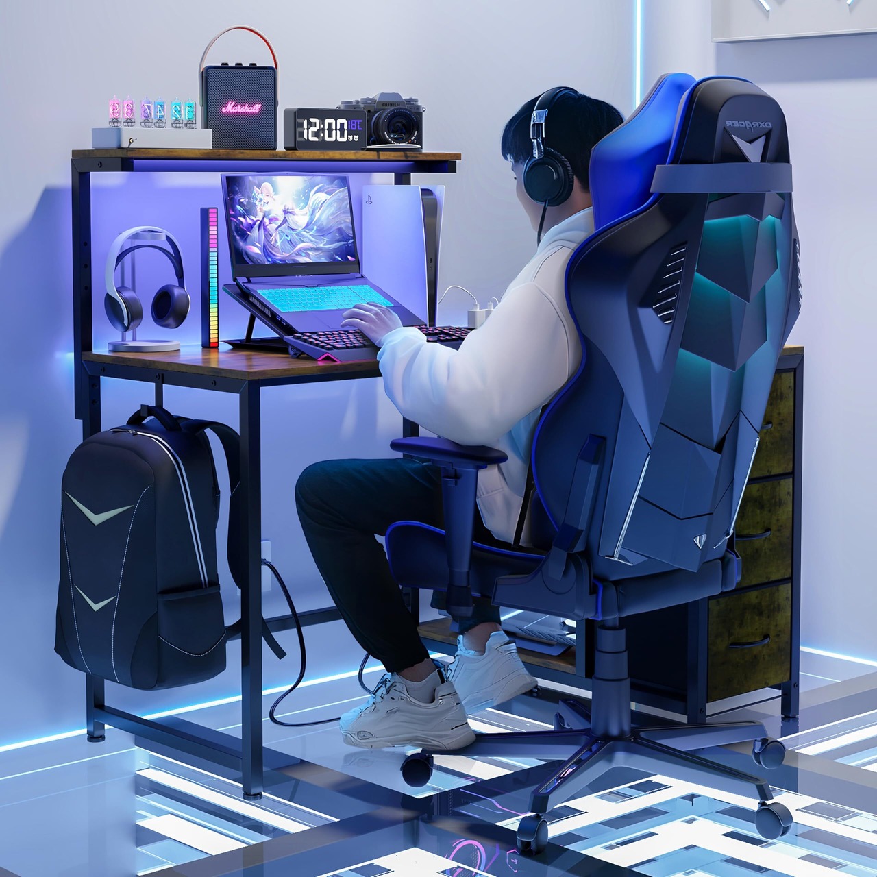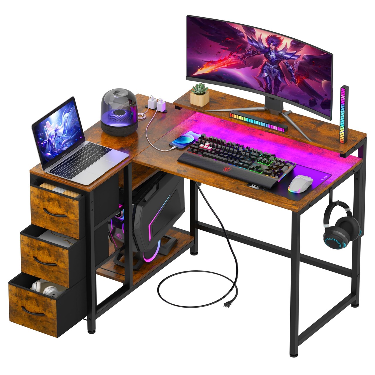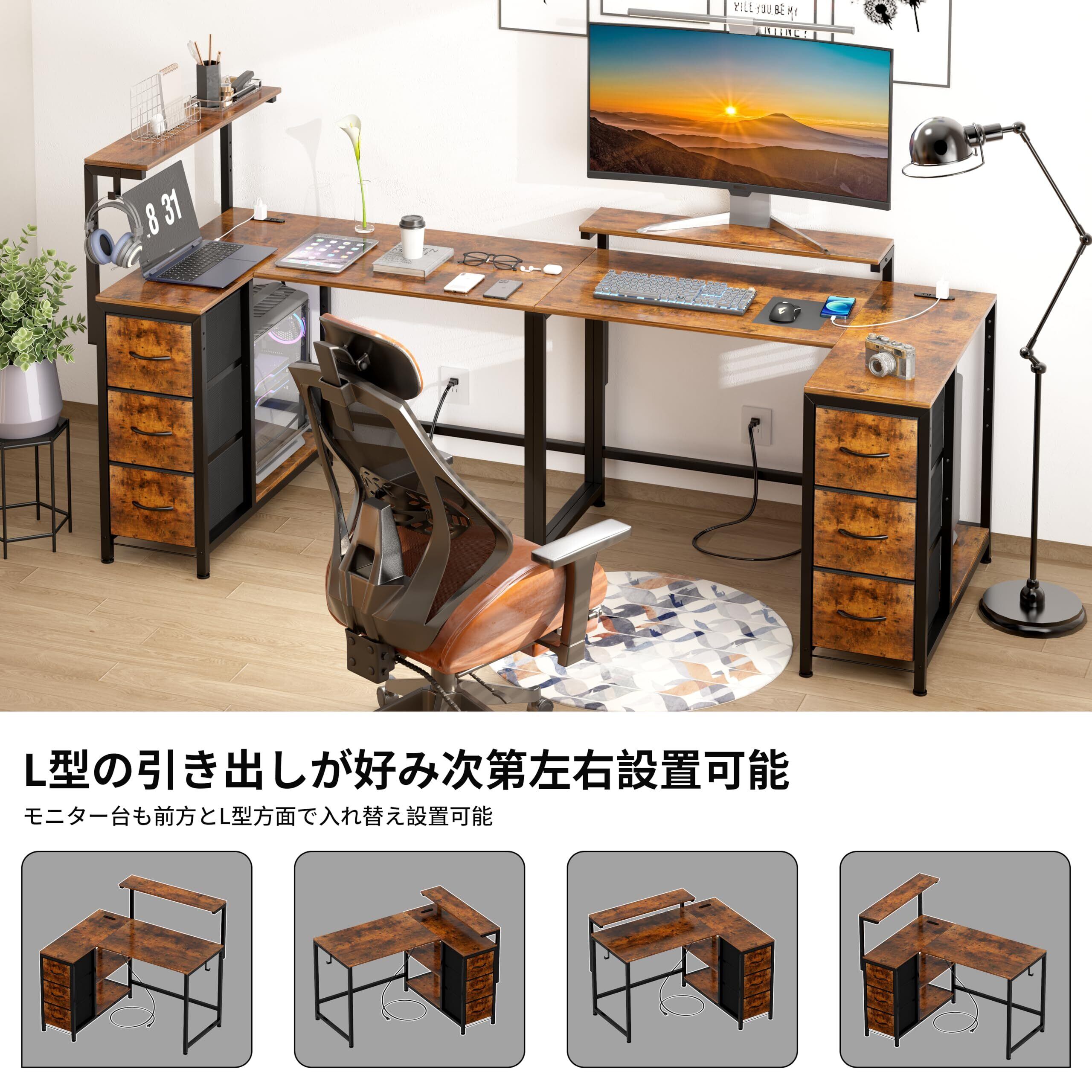 LunarLight PCパソコンデスク 幅108奥行80高さ85-108.5cm テレワーク L型デスク・左右組み換え自由 モニタ台の高さ調節可能 引き出しとコンセント付き 収納たっぷり ゲーミングデスク オフィスデスク 書斎 収納ラック付き (ヴィンテージRB L型)