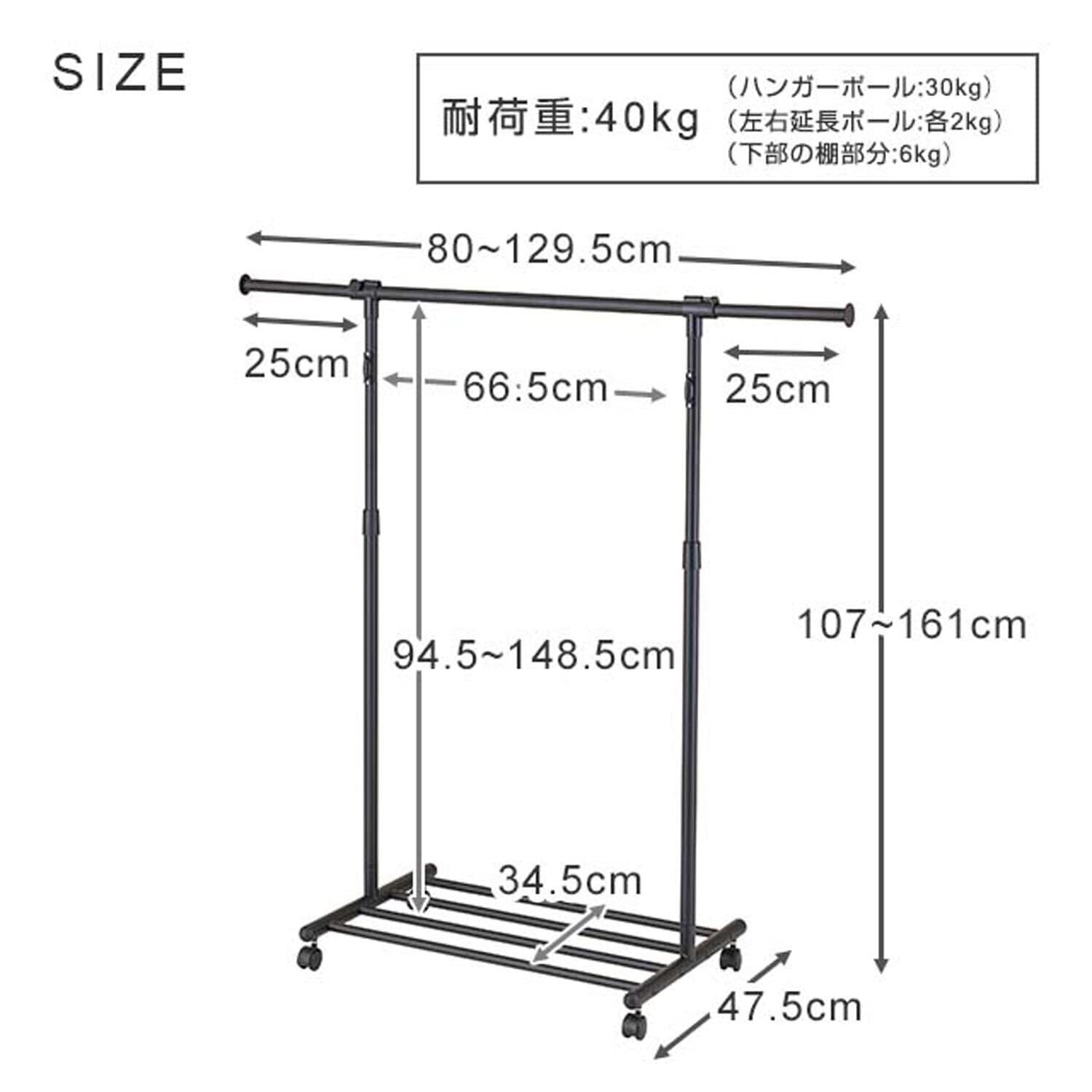 【新春セール】ドウシシャ ハンガーラック 楽ちん上げ下げハンガーシングル 白 頑丈 全体耐荷重40kg 幅80~129.5×奥行47.5×高さ107~161cm 縦横伸縮 下棚付き キャスター付き おしゃれ 押入れ 洋服収納 衣装 子供 大容量 室内干し RPHS-80WH