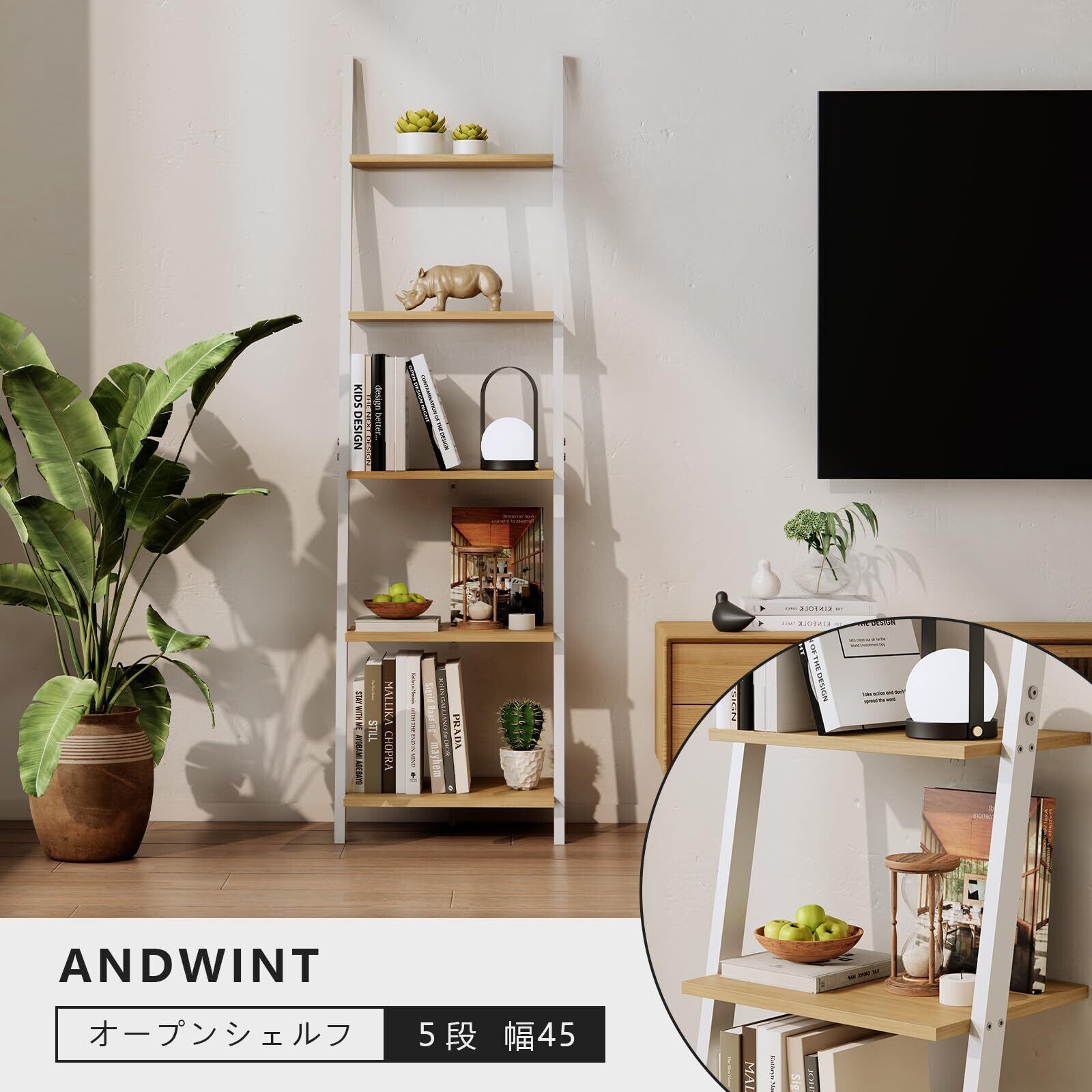 ANDWINT オープンラック 棚ラック木製 5段シェルフ おしゃれ 本棚スリム 飾り棚 壁面収納 北欧スタイル ホワイト 収納棚 玄関 リビングルーム 木目幅45×奥行35×高さ154.3cm オーク