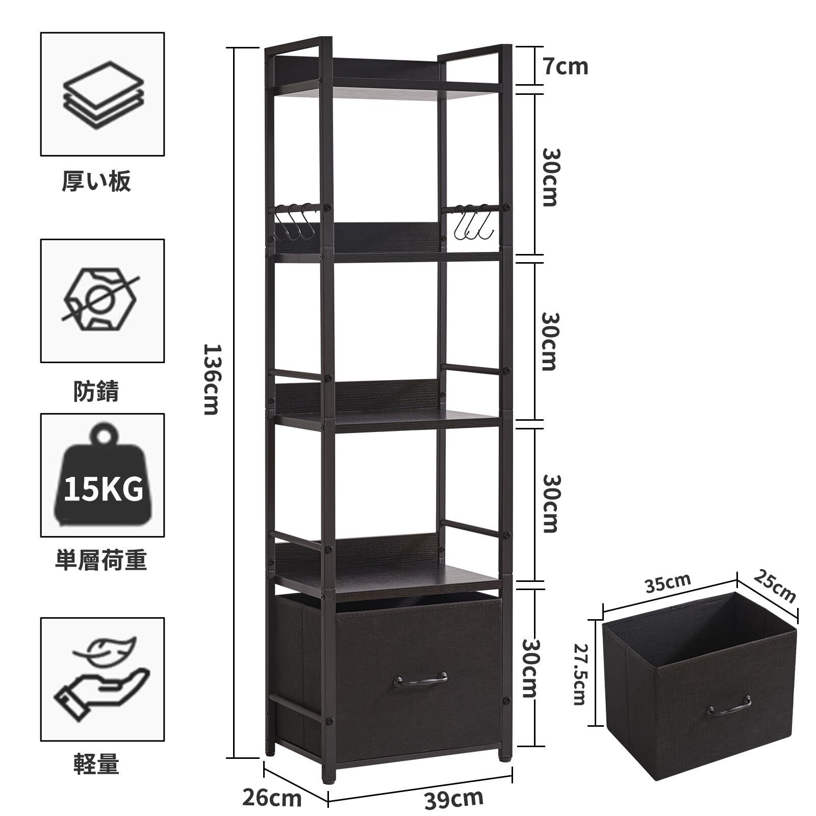 使いやすい:この棚ラックは取り付けやすく、分解も容易で、軽量で、移動や引っ越しに便利です。布の引き出しが1つ付いていて、物を分類して収納しやすく、部屋を清潔に保つことができます。また、6つのフックが付属しており、かばん、イヤホン、鍵、皮むき器と栓抜きなどの小物を収納できます
