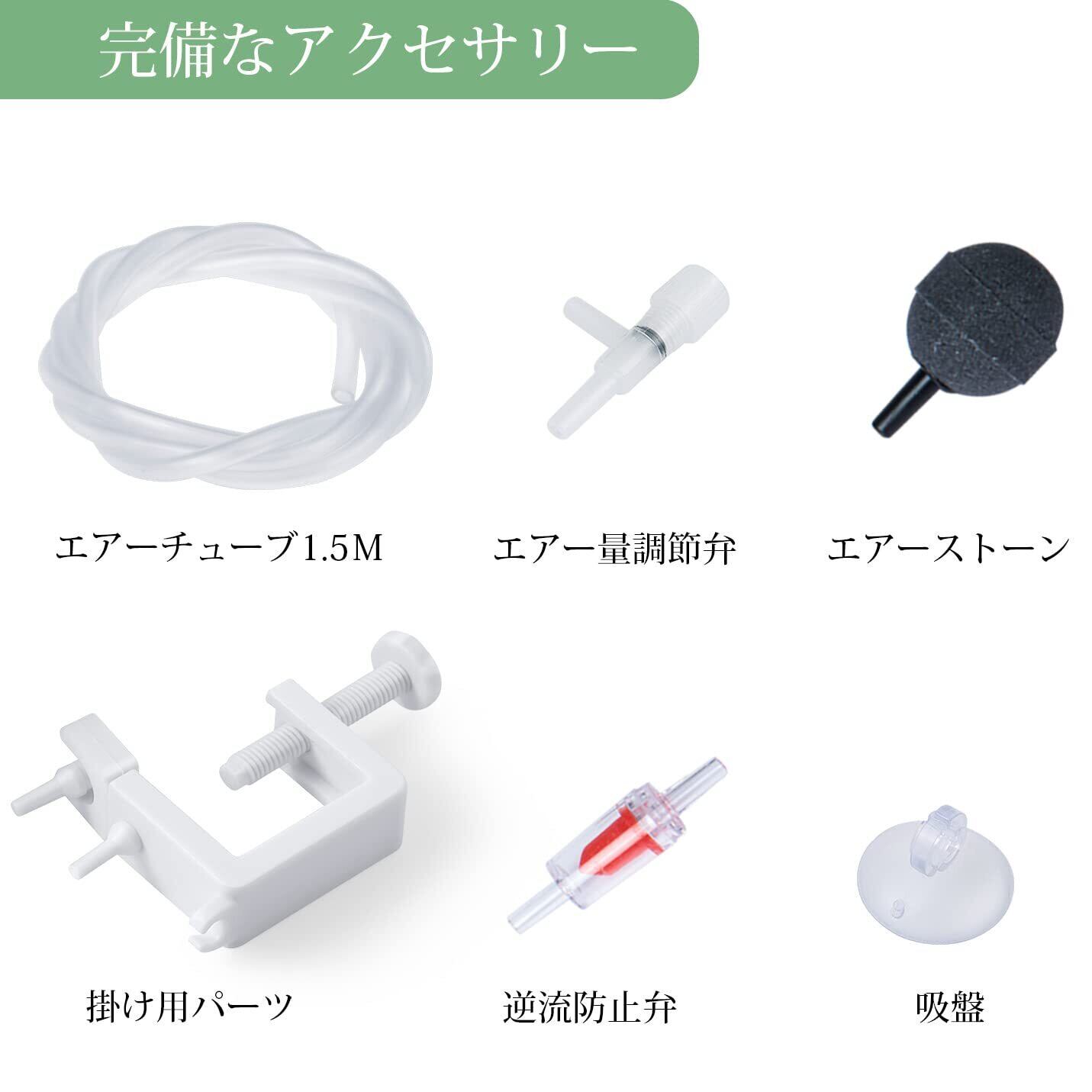 必要なすべてのアクセサリが付属しており:エアーチューブ1.5M/エアーストーン/逆流防止弁/エアー量調節弁/吸盤/掛け用パーツ。