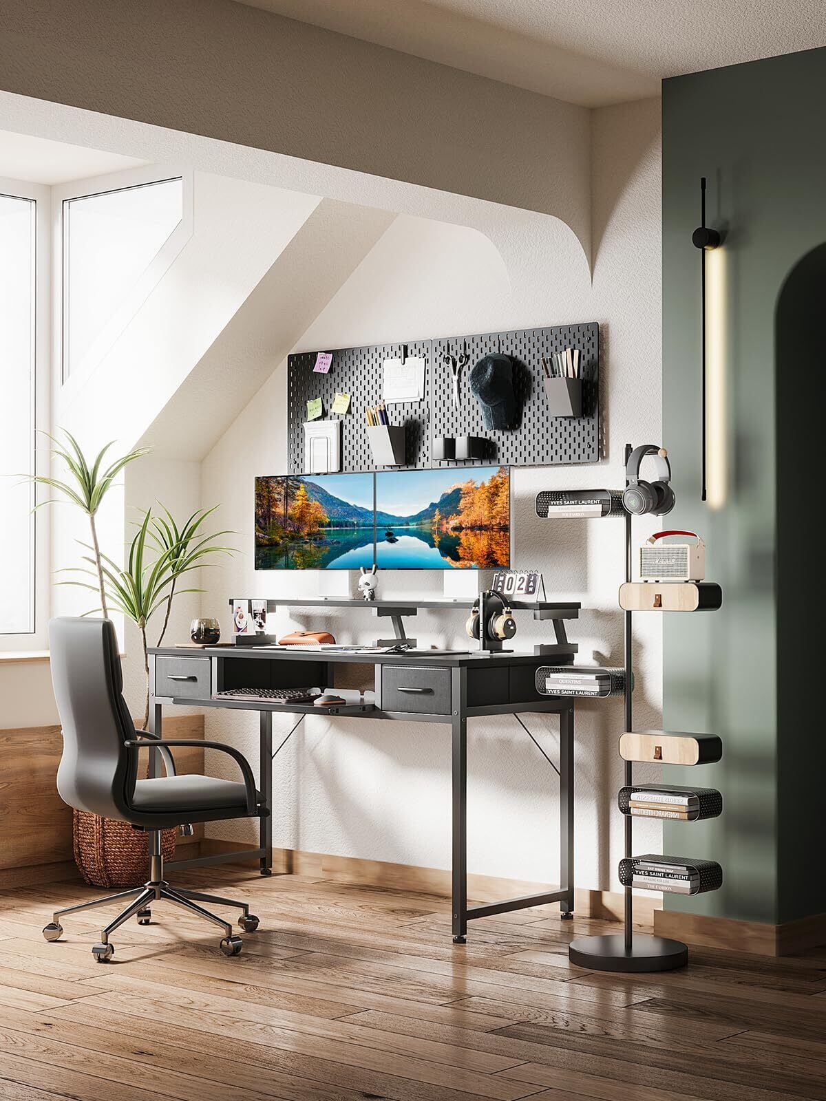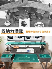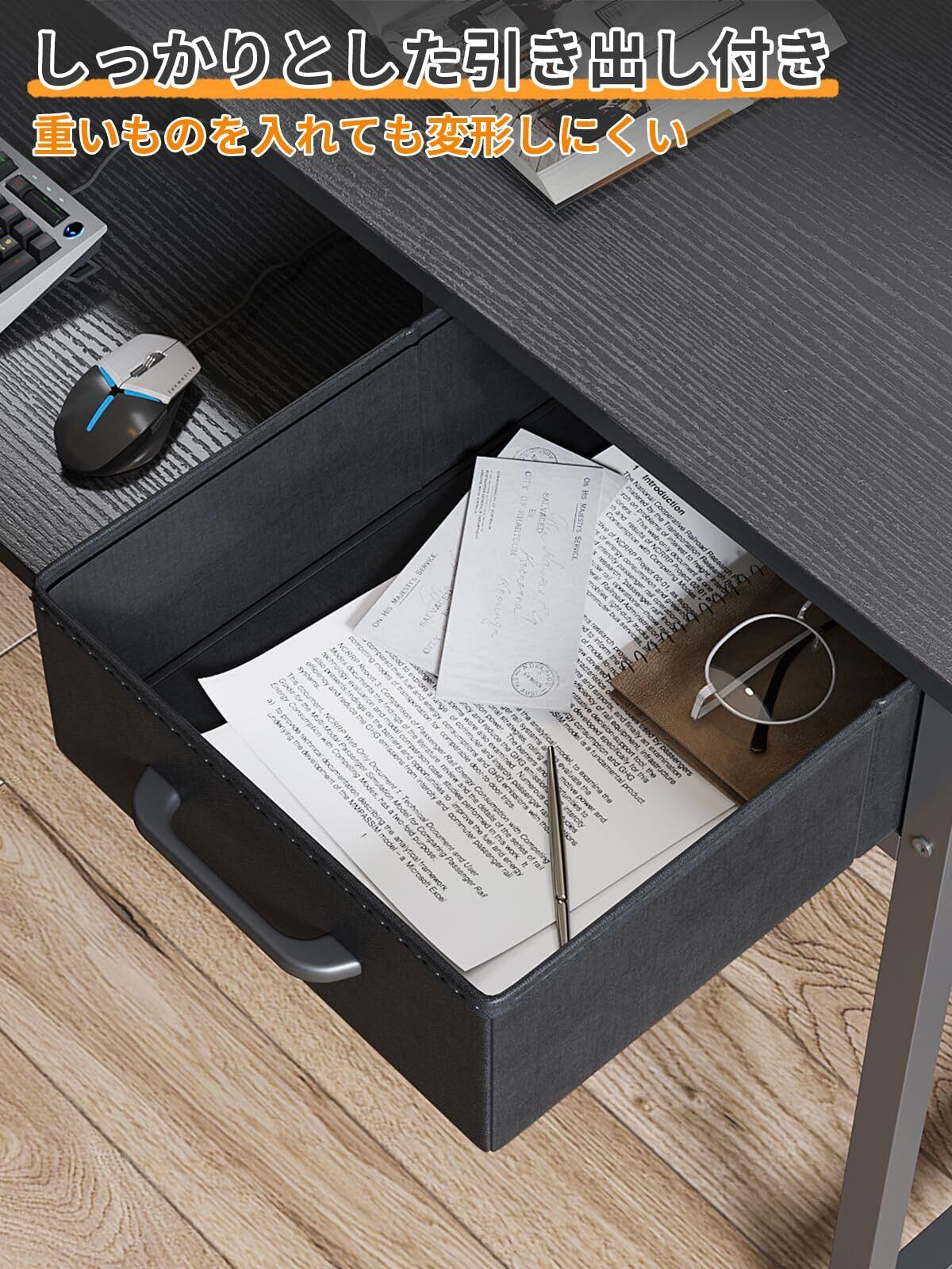 【引き出しが2杯付き、見える収納】引き出しはA4ファイルが収まる幅です。重いものを入れても変形しにくい。デスク周りの散らかりがちな小物が収納でき、机がスッキリ片付けられます。