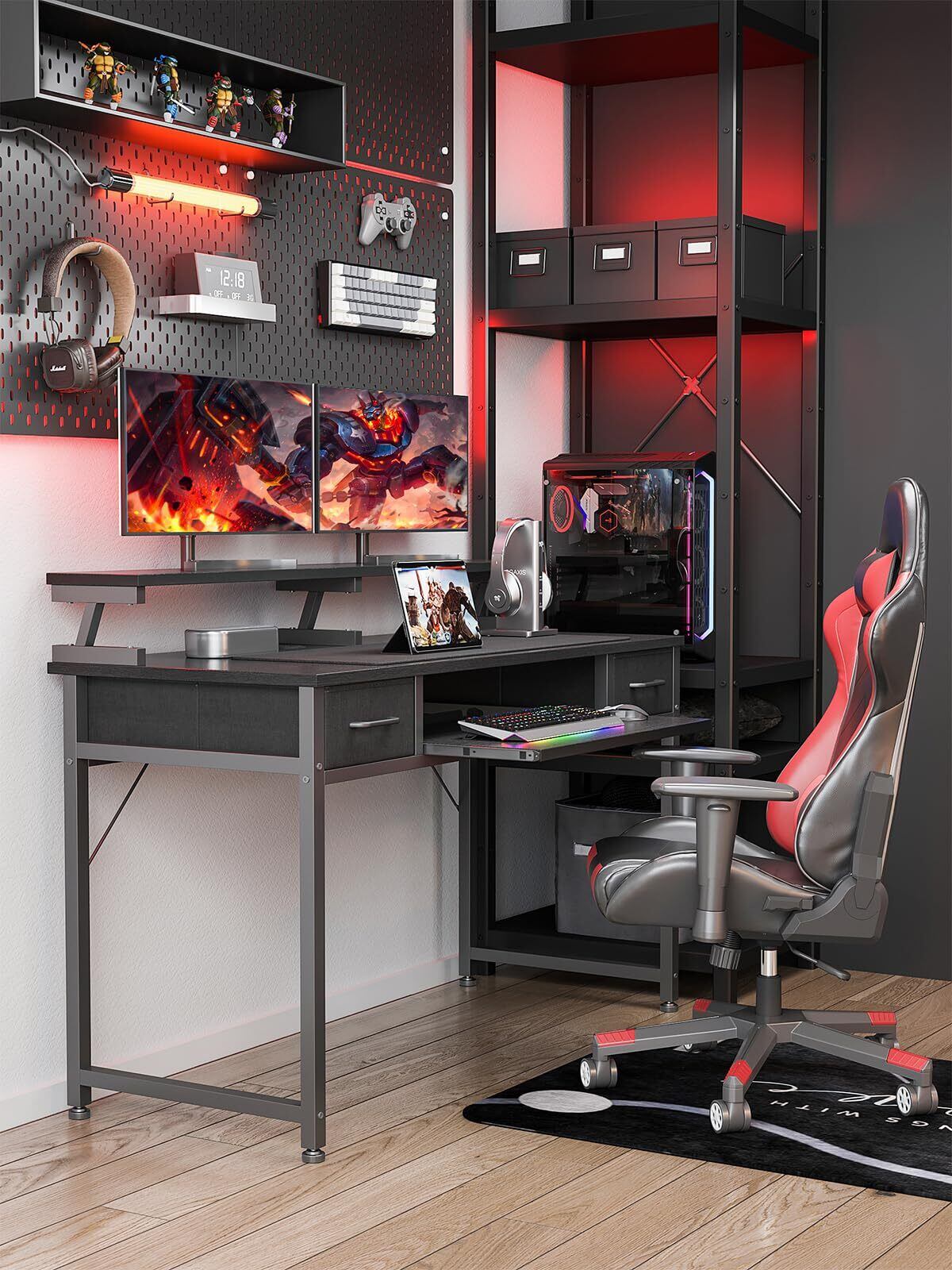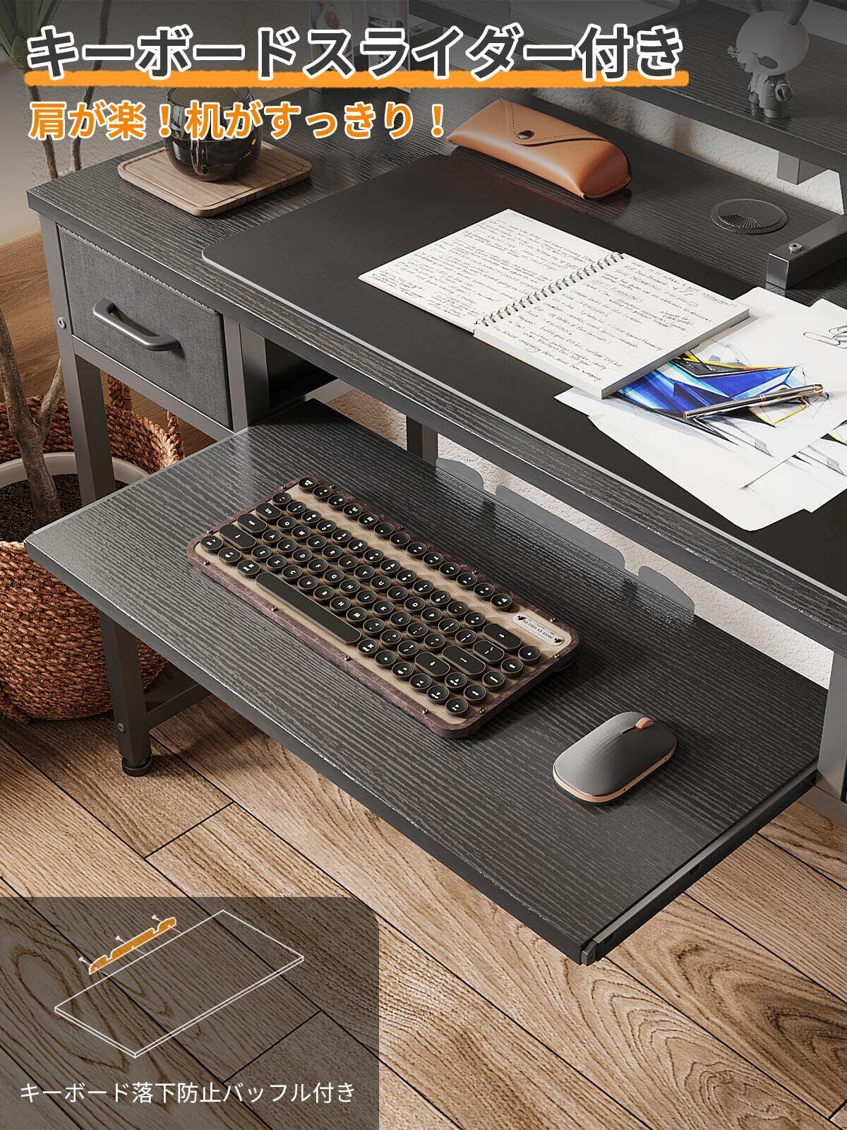 【滑らかに出し入れできるスライダー棚付き】キーボードを置けるのはもちろん、本や手帳などを置いて作業スペースとしても活用している。背面にはバッフルが備わており、ものの落下防止だけではなく、ケーブルを通すこともできる。床からスライダー棚までの高さは約67cmで、長時間作業あるいはゲームをしていても肩がラクラク~