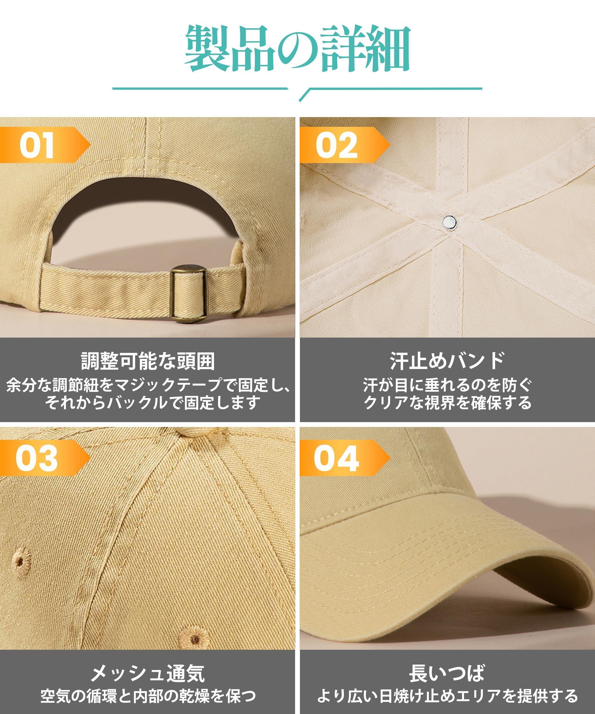 【商品説明】:HORADON 軽量 おしゃれ キャップ メンズ、UV キャップ 。紫外線対策、100%コットン、無地、変形しにくく、シワになりにくい、柔らかいクラウン設計、計算尽くされた洗練シルエット。対象:男女兼用。サイズ:56cm-60cm、深さ:約12cm、軽量:約73g。柔らかなクラウンデザインの帽子には防シワ加工が施されており、折りたたんで圧縮しても変形したりシワになったりすることはない、ちょっと片付けるだけで、元の形に戻る。外出時にヘアスタイルを整えるのを忘れても、毎日の日焼け対策を忘れても、重宝すること間違いなし。折りたたんで持ち運ぶこともできる、毎日手放せない頼もしい相棒!