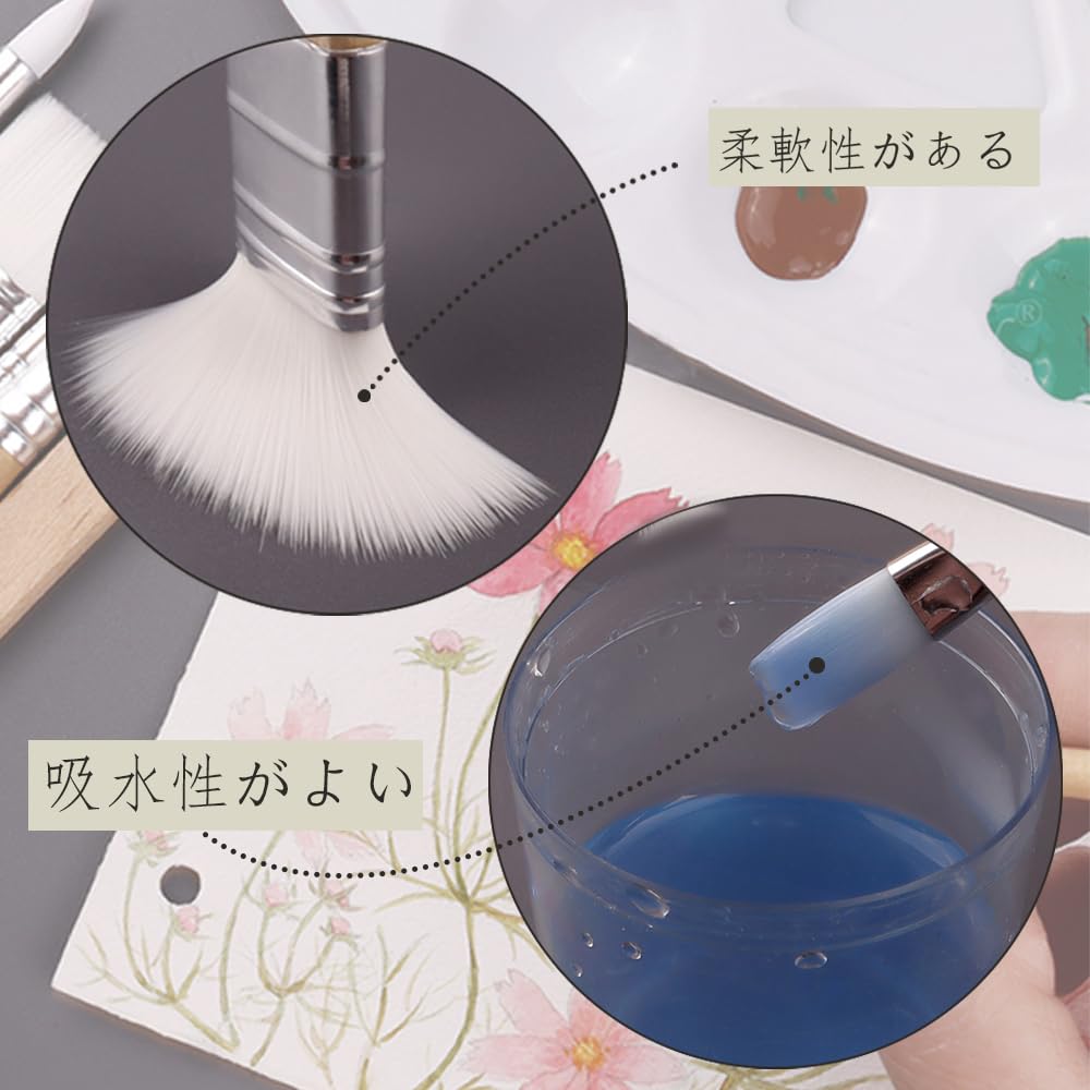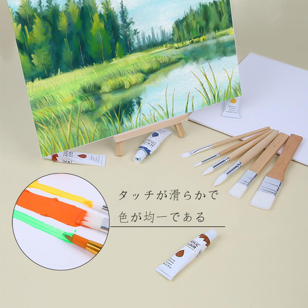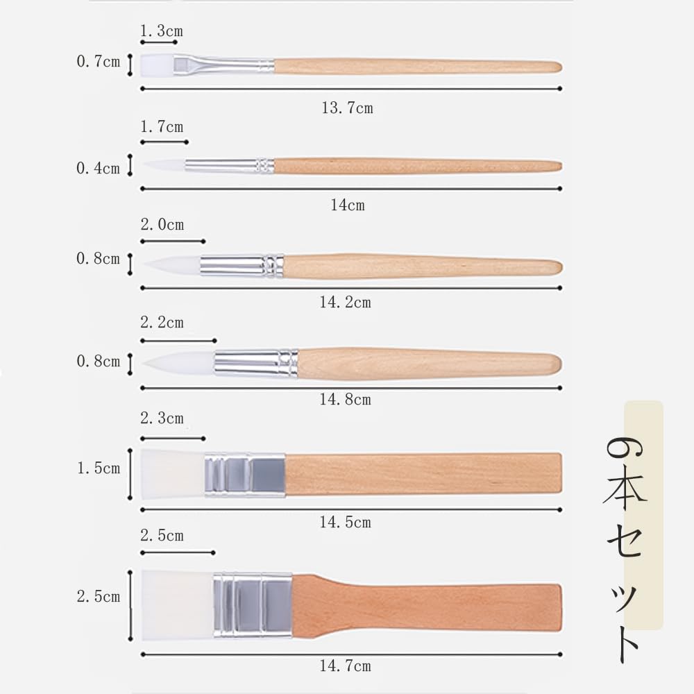 【商品仕様】約13.7cm-14.7cmのサイズで、6本のペイントブラシがセットになっています。異なるタイプや形状が揃っており、さまざまな絵画ニーズに対応します。
