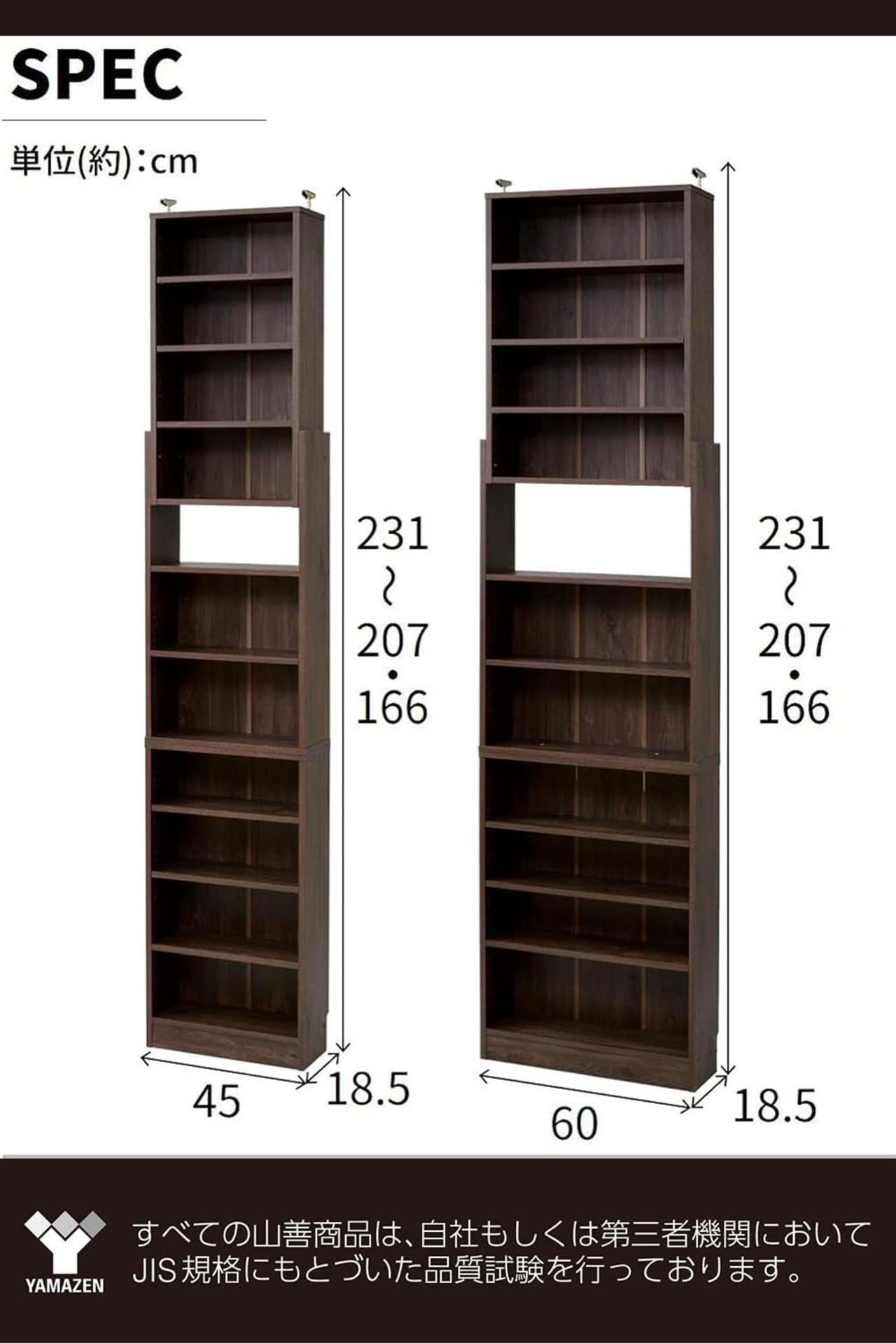 ●本体サイズ : 幅45×奥行18.5×166・207-231cm●全体耐荷重 : 150㎏(棚板耐荷重 : 1枚あたり10㎏)●構造部材 : プリント紙化粧繊維板、プリント紙化粧パーティクルボード●東証プライム(株)山善で扱うすべての山善商品は、自社もしくは第三者機関において、JIS規格に基づいた品質試験を行っております。