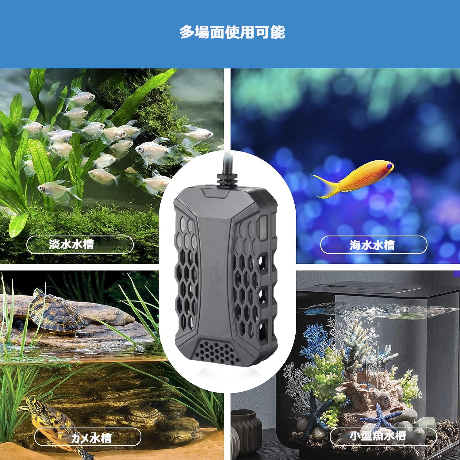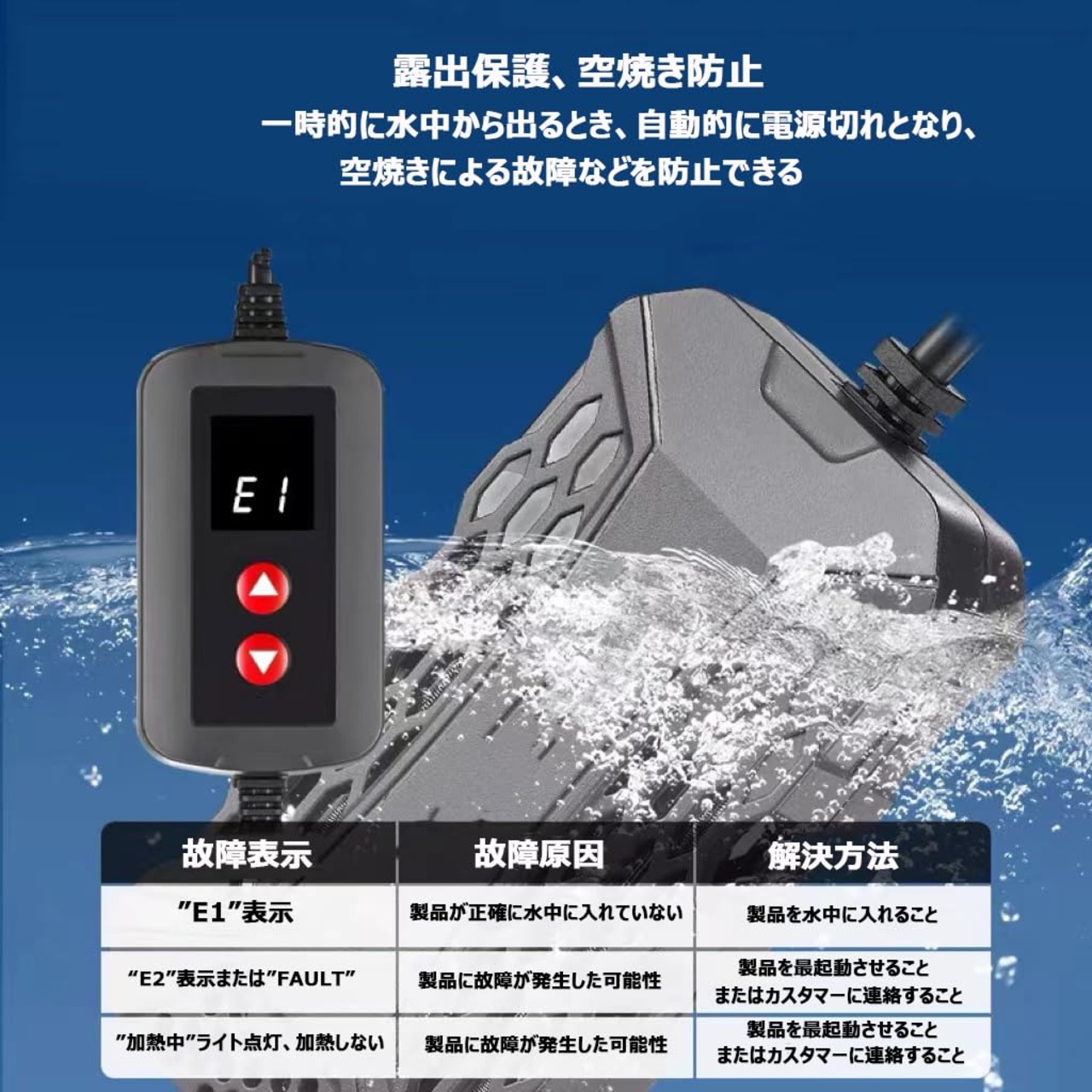 エラー表示機能:水槽 ヒーターが一時的空気中に出た場合や、何かの不適切でご使用なさった場合、エラー表示をして、安全の上、タイムリーに問題を解決することができます。