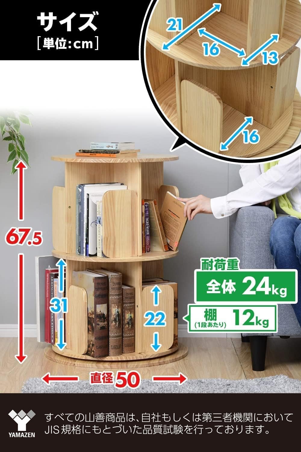 山善(YAMAZEN) 本棚 (回転式本棚) 絵本棚 天板に物が置ける A4が入る高さ 2段 (直径50cm×高さ67.5cm) 天然木 漫画 小さい本棚 ブックシェルフ 組立品 ナチュラル TKR-2(NA)