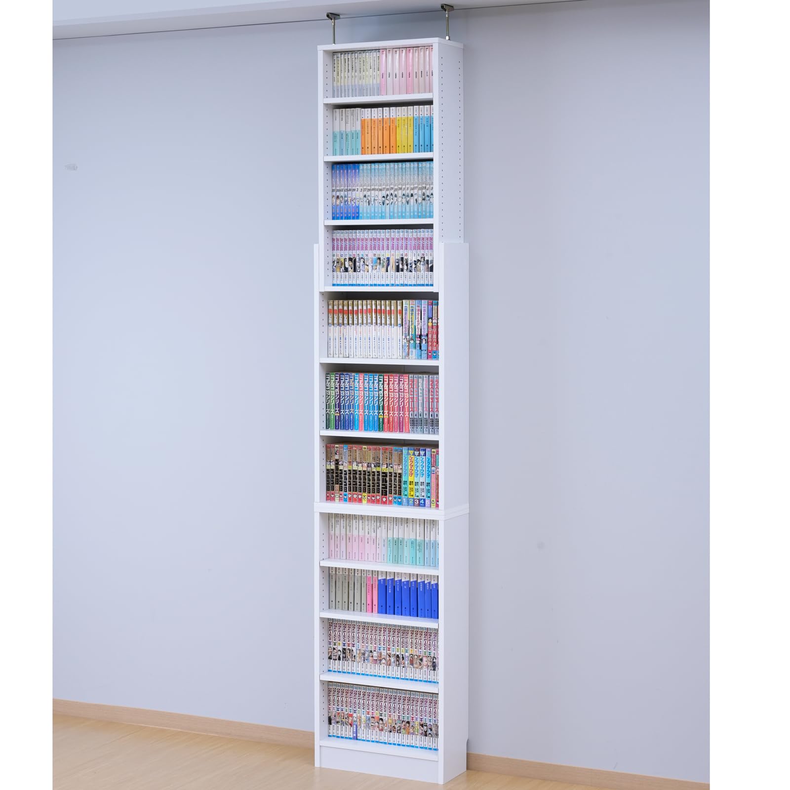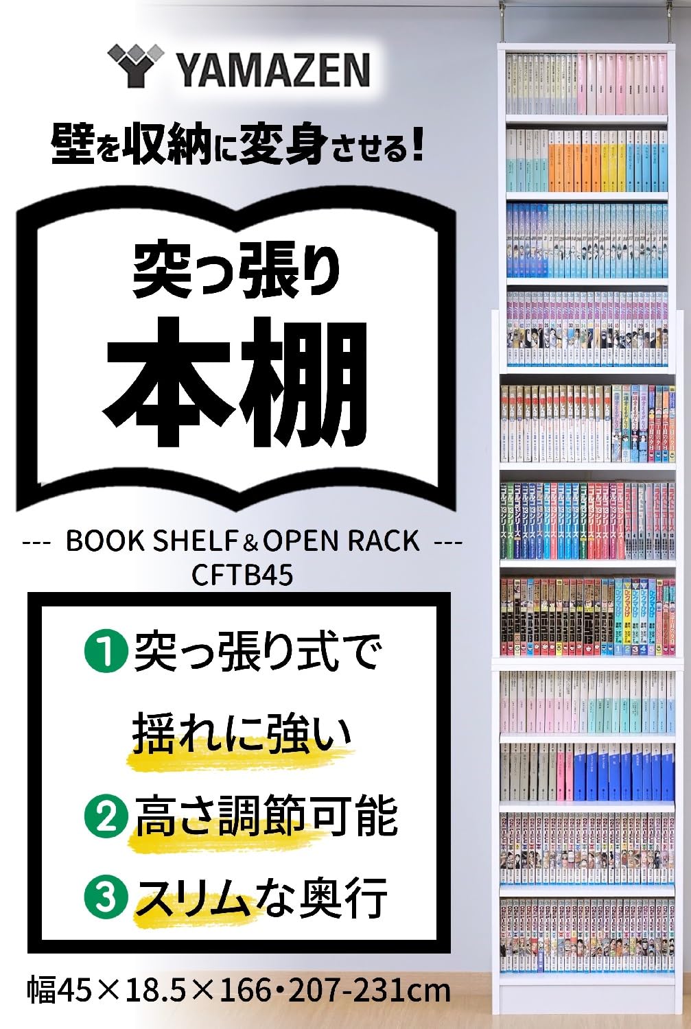 山善(YAMAZEN) 本棚 大容量 スリム 突っ張り式 棚板高さ調節 幅45×奥行18.5×166・207-231cm 壁にピッタリ 漫画 コミック ラック 収納 組立品 ホワイト CFTB45(WH)
