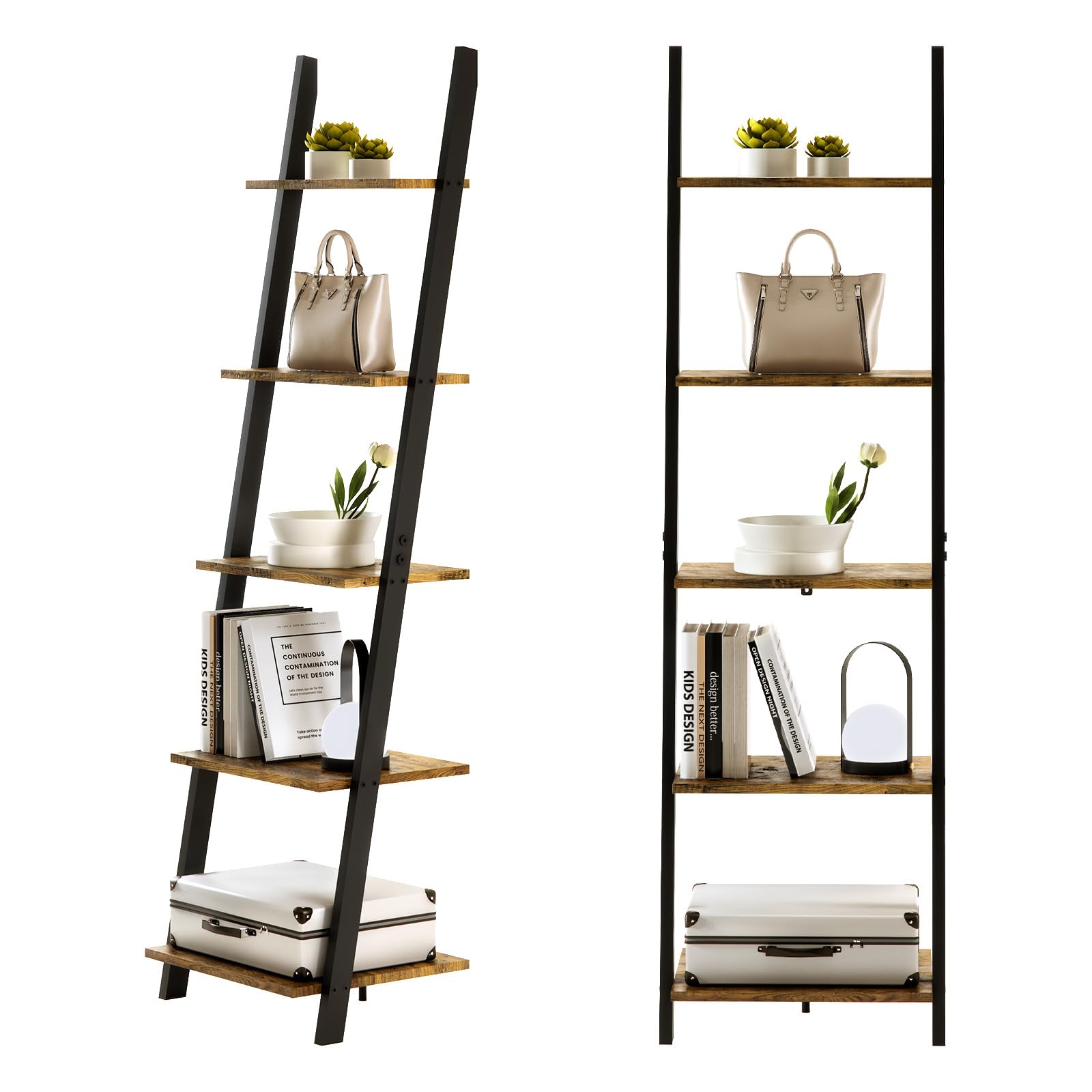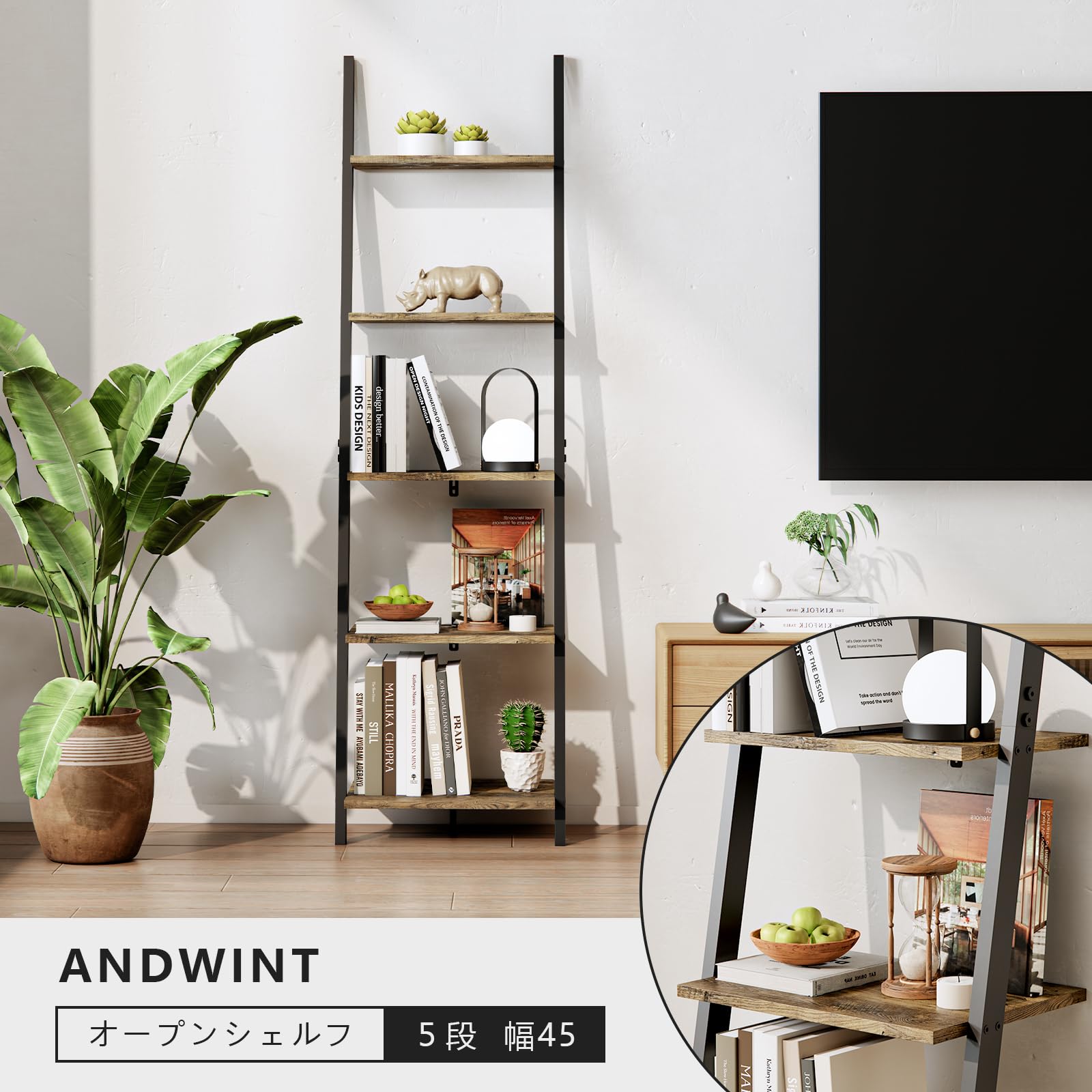 ANDWINT オープンシェルフ 飾り棚 棚ラック木製 5段ラック おしゃれ 本棚スリム 壁面収納 北欧スタイル ブラウン 収納棚 玄関 リビングルーム 木目幅45×奥行35×高さ154.3cm ブラック