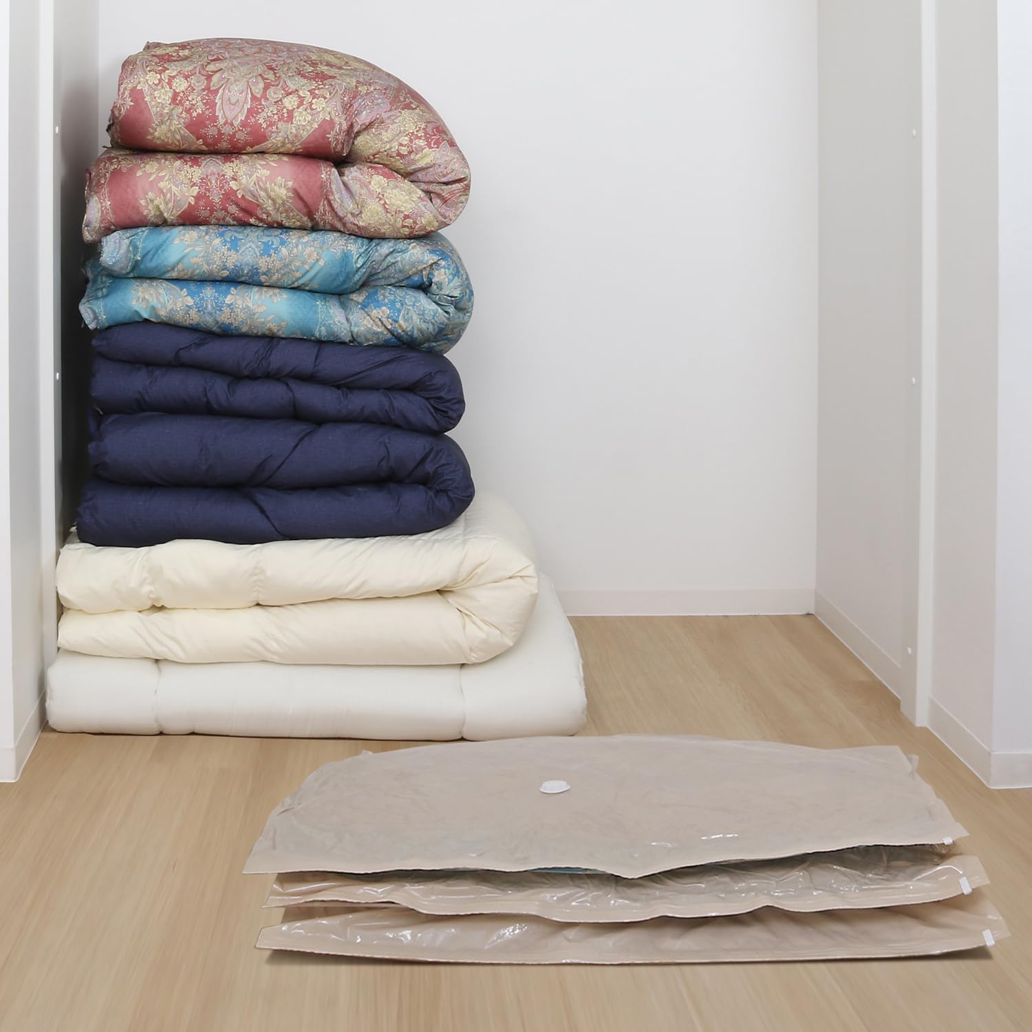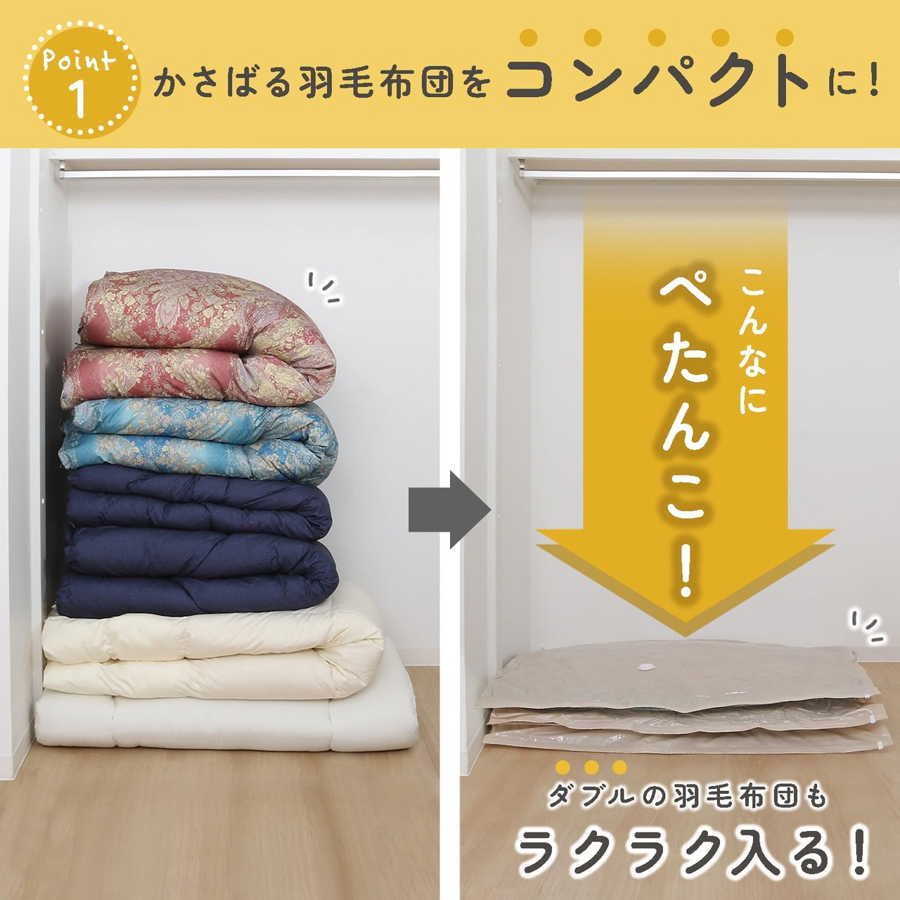 【羽毛布団を圧縮しコンパクトに保管】:オフシーズンのかさばる羽毛布団や来客用の布団一式などをコンパクトに保管。