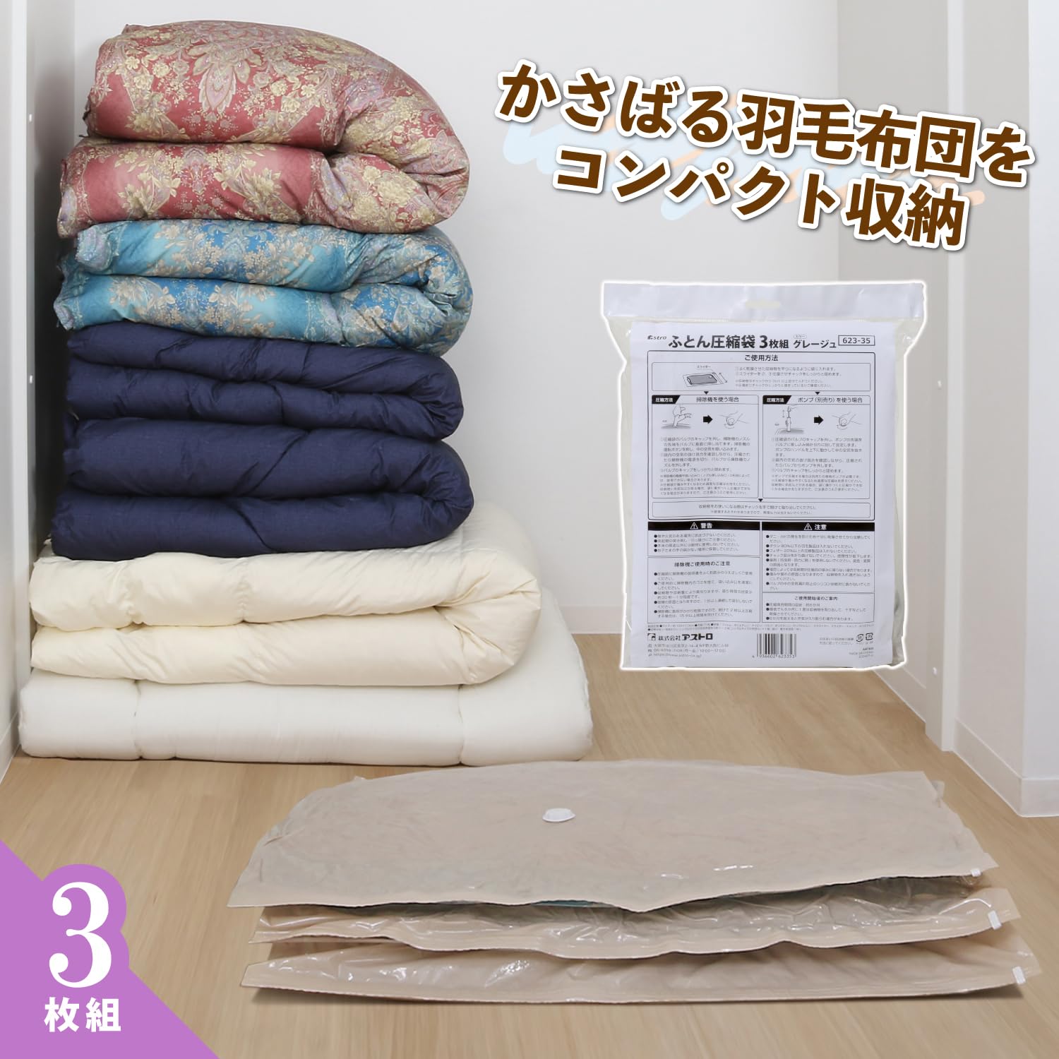 アストロ グレージュ×透明 圧縮袋 3枚組 シングル・ダブル兼用 大きめ 110×100cm 羽毛布団 ふとん 保管