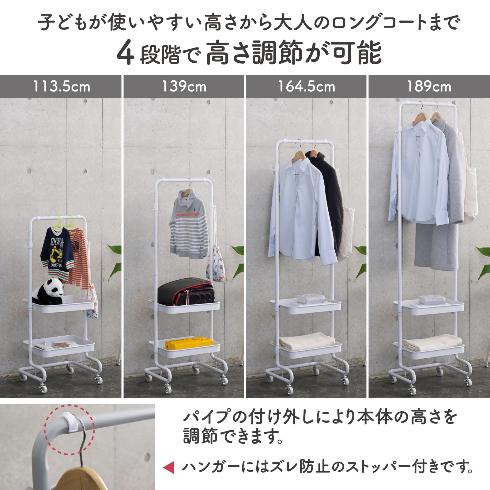 【高さを4段階で調節できる】パイプを付け外しすることで、高さを4段階で調節できます。お子さまの成長に合わせて調節したり、冬には1番高くしてロングコートなどの上着掛けにするなど季節に合わせて変えられます。