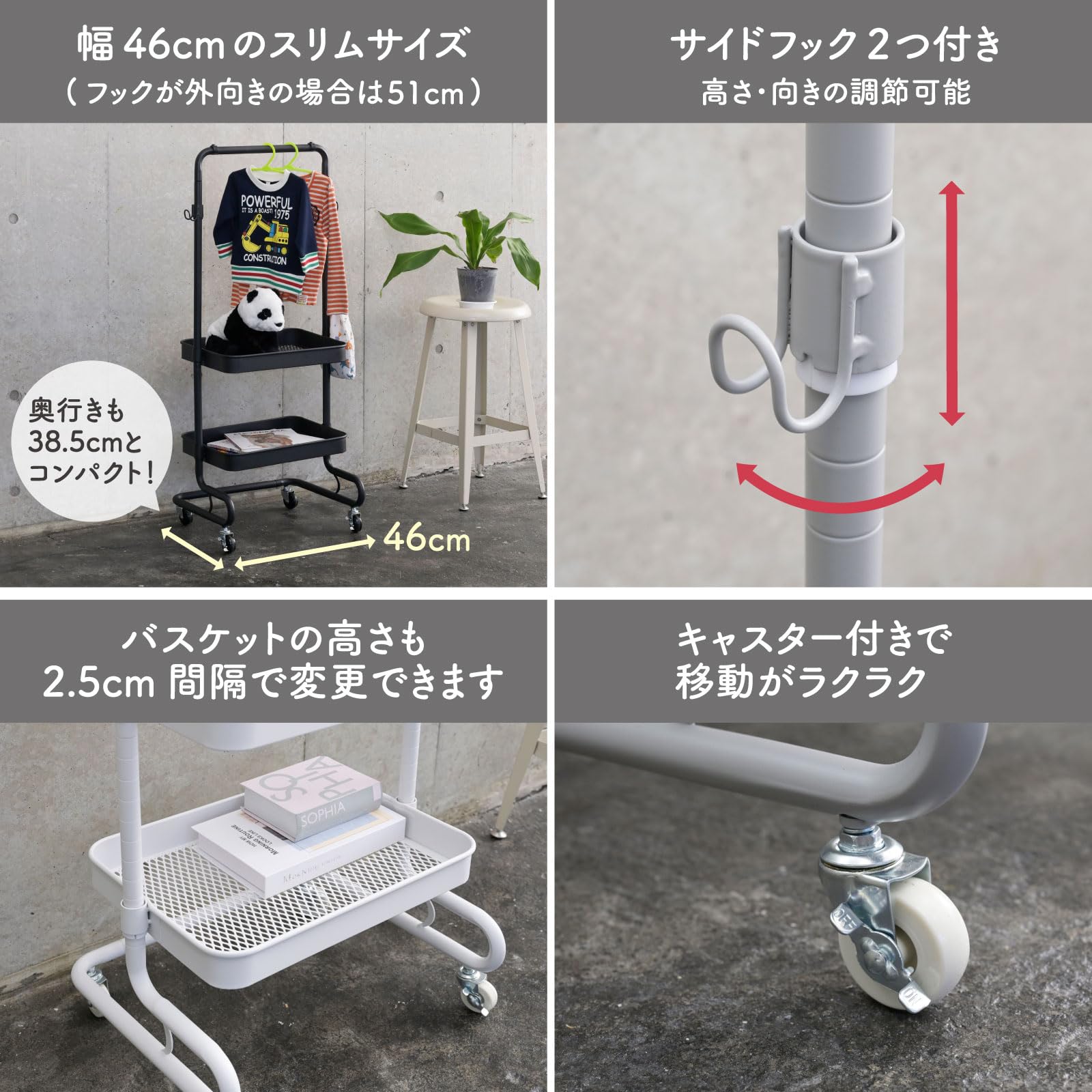 ●本体サイズ(約):幅51×奥行38.5×高さ113.5/139/164.5/189cm(高さは4段階で調節可能)●全体耐荷重 : 27kg(ハンガーバー上段 : 5kg、バスケット1個あたり: 10kg、フック1個あたり: 1kg)●構造部材 : フレーム、バスケット/金属(スチール) キャスター /ポリプロピレン●表面加工 : テーパースリーブ/ABS樹脂 フレーム/エポキシ樹脂塗装●お客様組立品