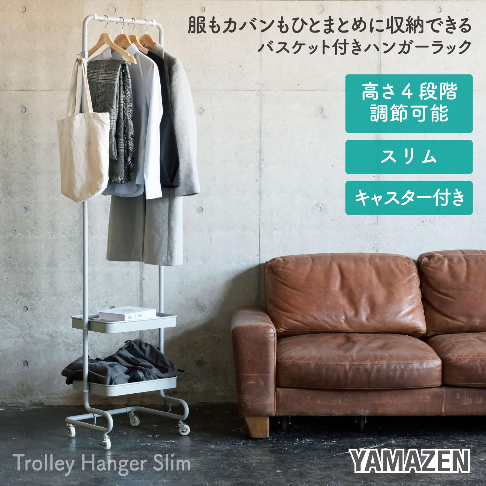 山善(YAMAZEN) ワゴン ハンガーラック トローリーハンガー スリム キャスター付き (高さ4段階調節/バスケット2つ付き/全体耐荷重27kg) 幅51×奥行38.5×高さ113.5/139/164.5/189cm 衣類収納 組立品 ホワイト LTHS-2(WH)