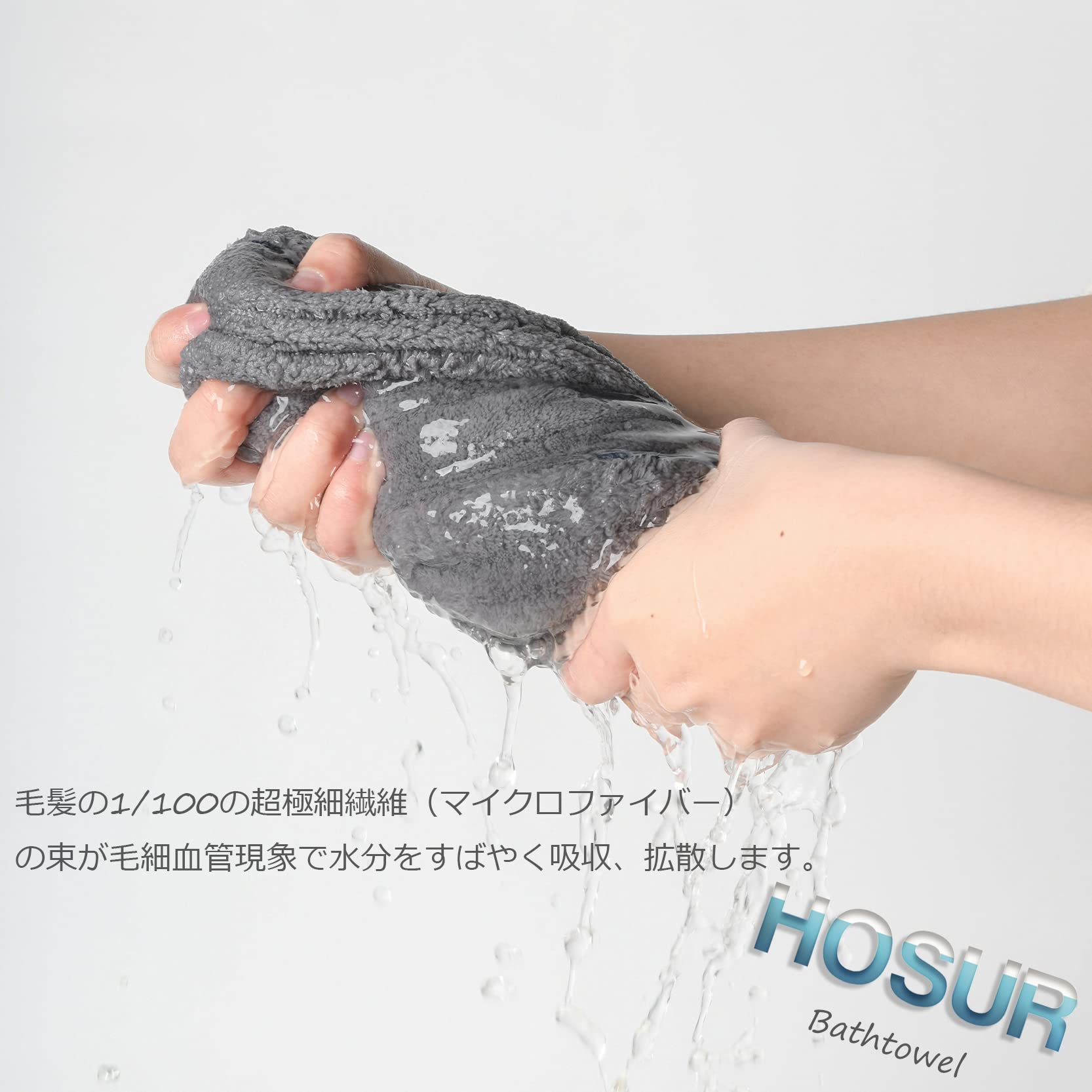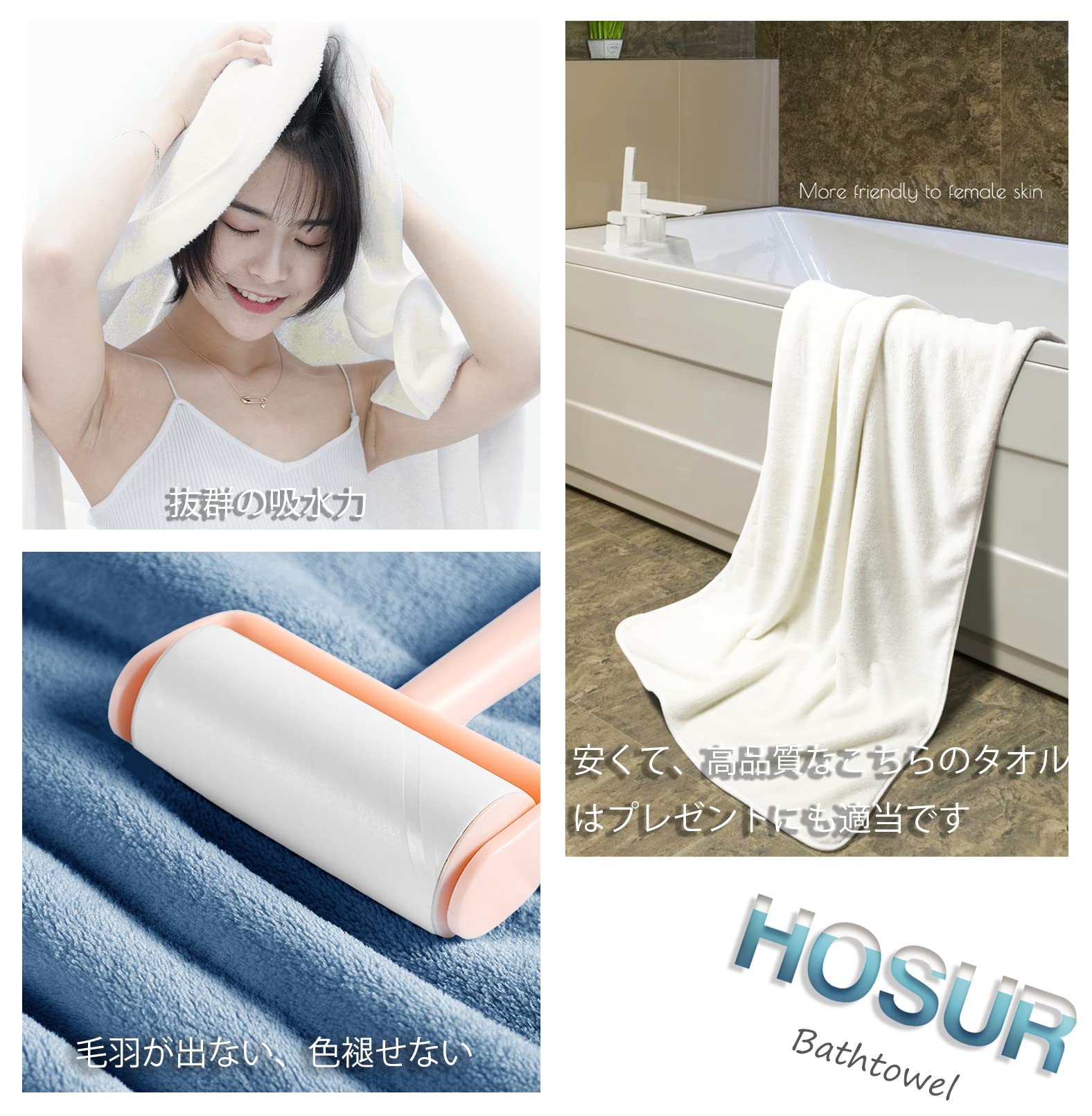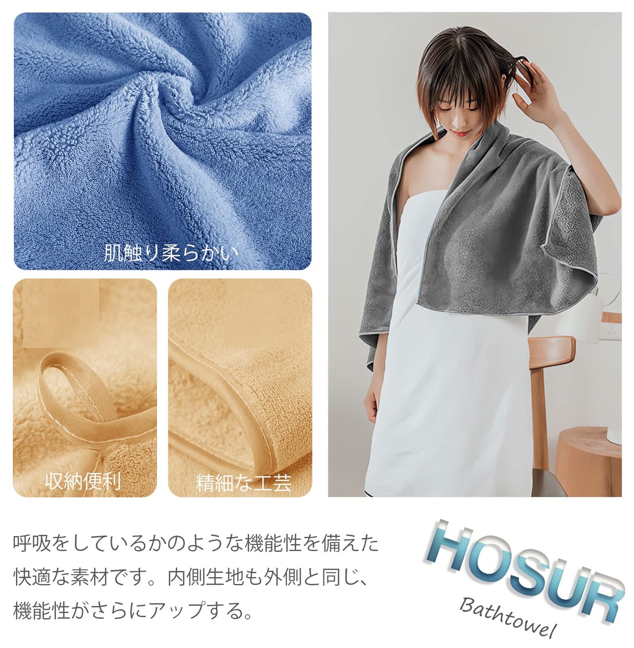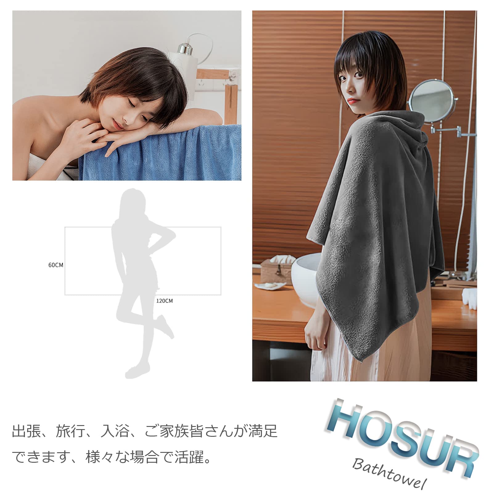 【HOSUR バスタオル 4枚セット】サイズ:約60×120cm 材質:極細繊維のマイクロファイバー素材(ポリエステル85%、ナイロン15%) 特徴:抜群の吸水性と速乾性、肌触り柔らかい、軽量、糸抜け防止、通気性が強くて、耐久、静電気がなくて、蛍光もありません。
