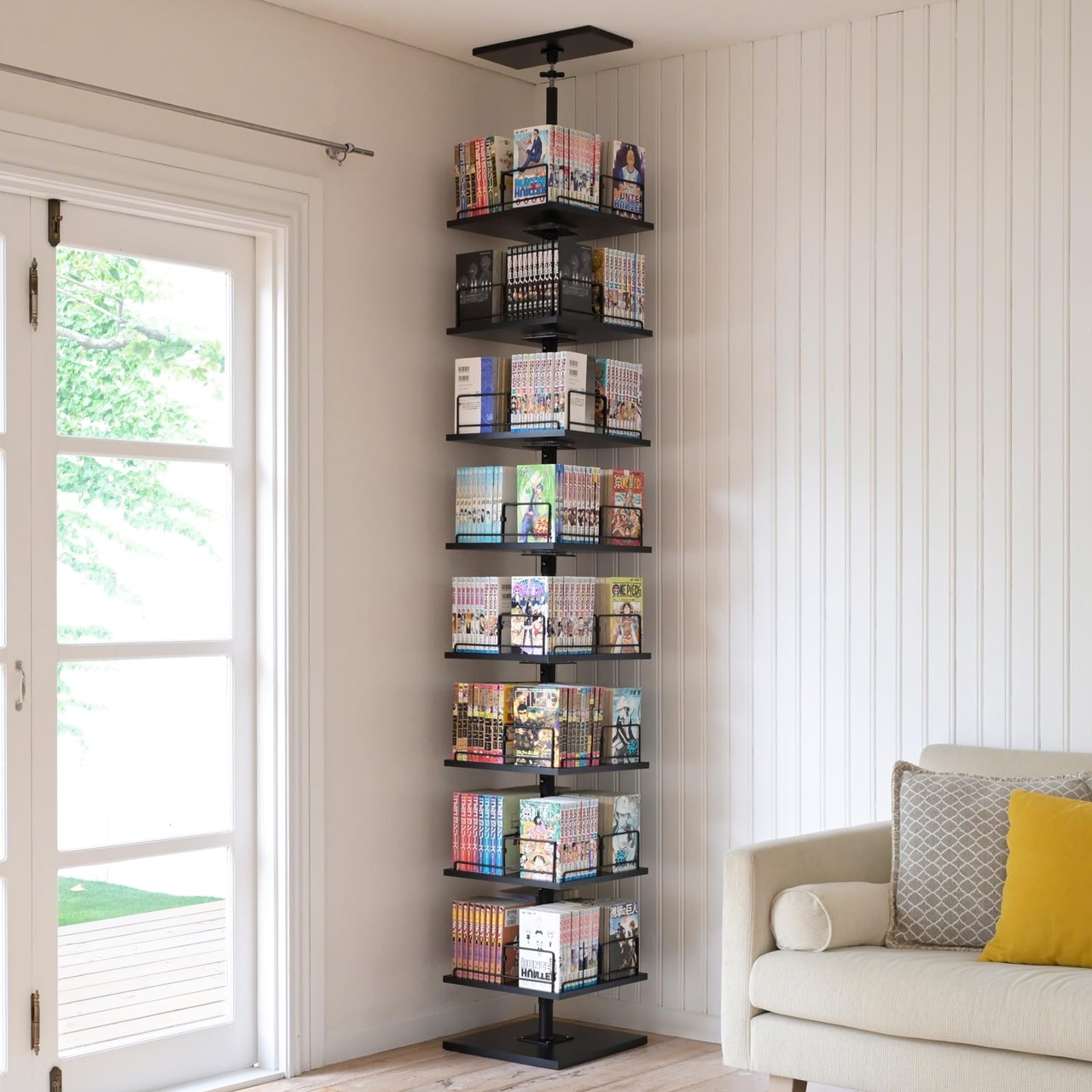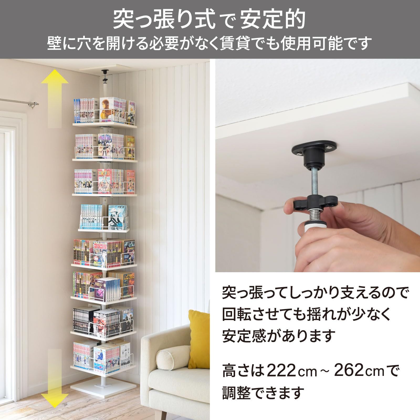 【スリムでも大容量】突っ張り式なので揺れにも強く、省スペースでも本をたっぷり収納できる回転本棚です。
