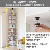 ●サイズ(約) : 幅34cm×奥行34cm×高さ222(最小222/最大262)cm●構造部材 : フレーム/金属(スチール)、棚板/合成樹脂化粧繊維板(メラミン樹脂) ●表面加工 : フレーム/エポキシ樹脂塗装●耐荷重:全体120kg(棚板1枚あたり 15kg)●収納目安(全体) : 文庫本約224冊、コミック約288冊、DVD約288枚