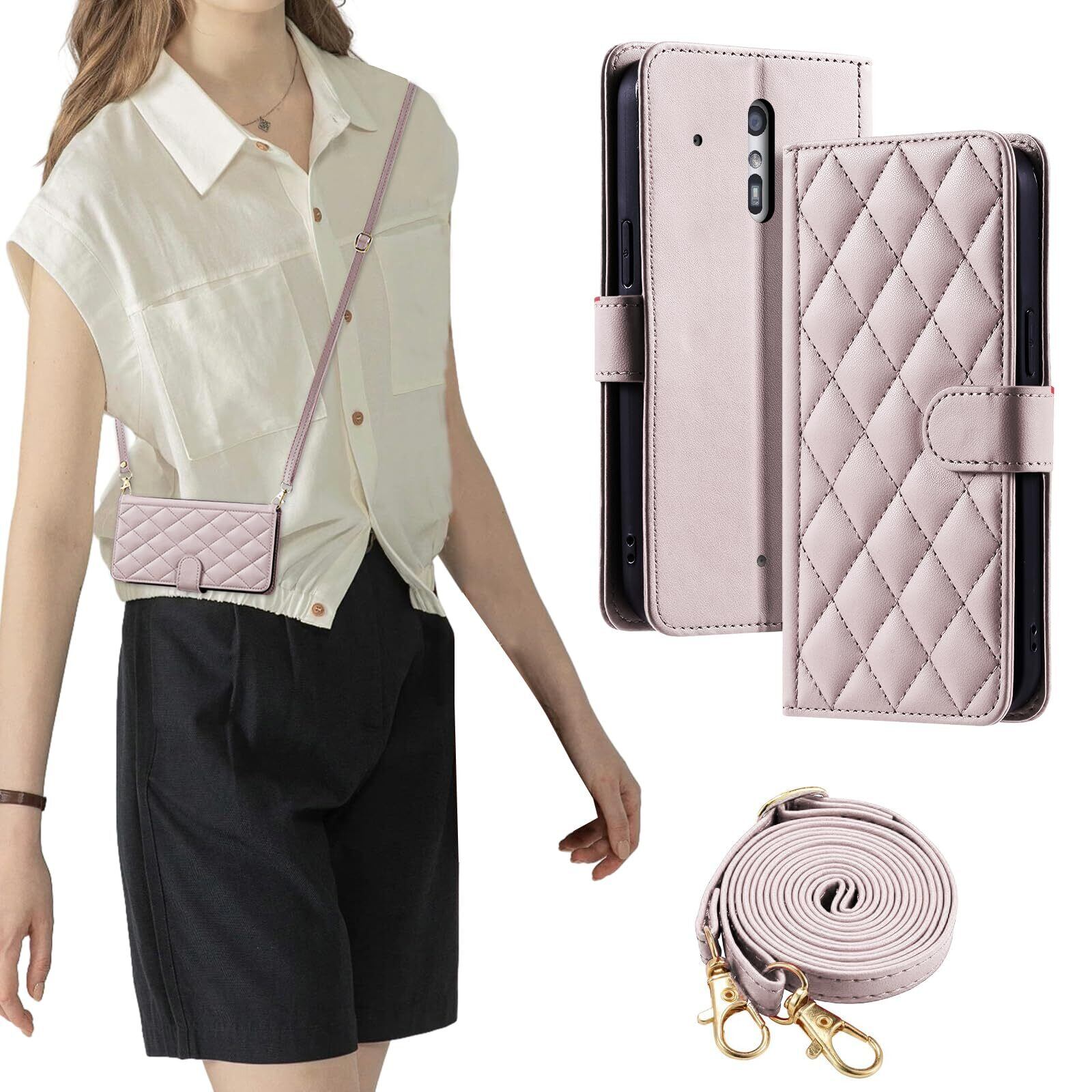 laddutoi FOR らくらくスマートフォン F-42A / らくらくスマートフォン me F-01L ケース 手帳型 おしゃれ ストラップ付き スタンド機能 カード収納 軽量 薄型 耐衝撃 高級PUレザー 滑り防止 財布型 内蔵マグネット 開閉式 チェック柄 上質 耐摩擦 マグネット式 肩掛け 斜め掛けーピンク