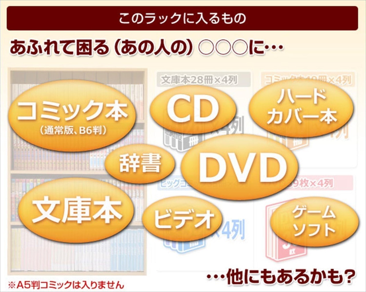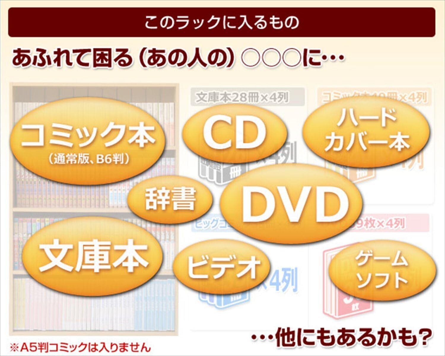 ●組立品です●組立時間:約20-30分●コミック、DVD、CD、文庫本など本やソフト収納に最適なラック●奥行スリムで省スペースデザイン●コミック収納目安:200冊●DVD収納目安:180枚●文庫本収納目安:150冊●オープン部内寸:幅56 奥行15 高さ20cm●棚板:固定式4枚●板厚:12mm