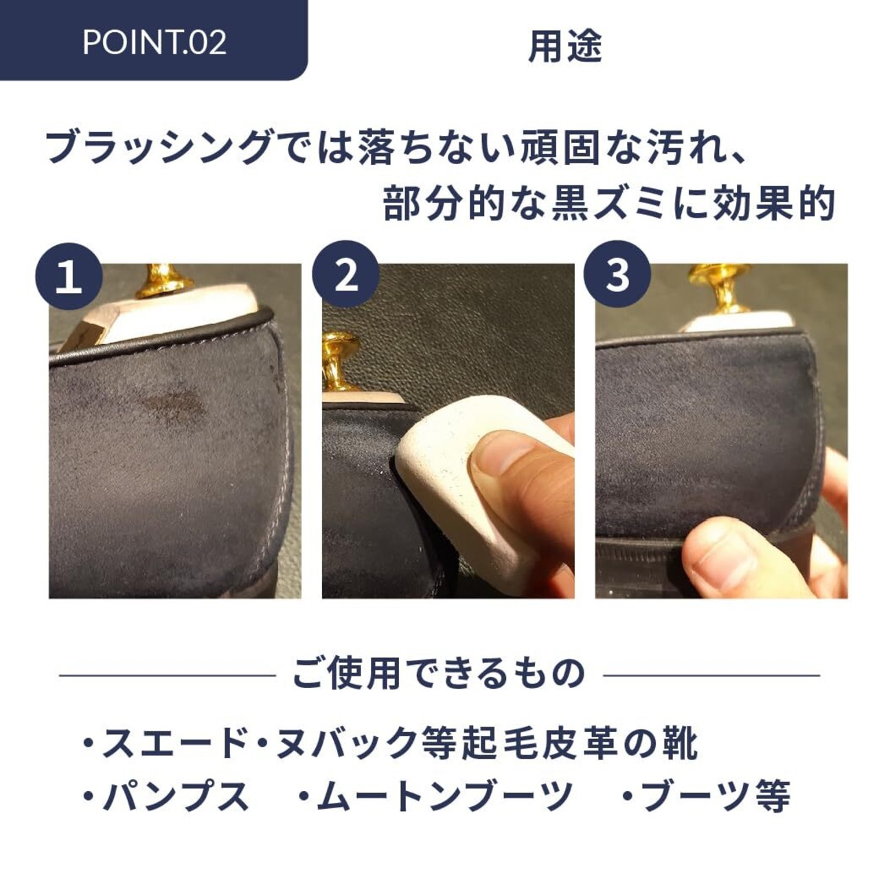 スエード・ヌバック製品についたブラッシングでは落ちない頑固な汚れをきれいにするクリーナーです。微粒子ゴムを柔らかくブロック状に固めていますので、非常にソフトで素材を痛めにくいタイプです。薄い色のスエード・ヌバック製品には欠かせないアイテムです。使用後、消しカスのようなものが表面に付着する場合がございます。ブラッシングで払い落してください。