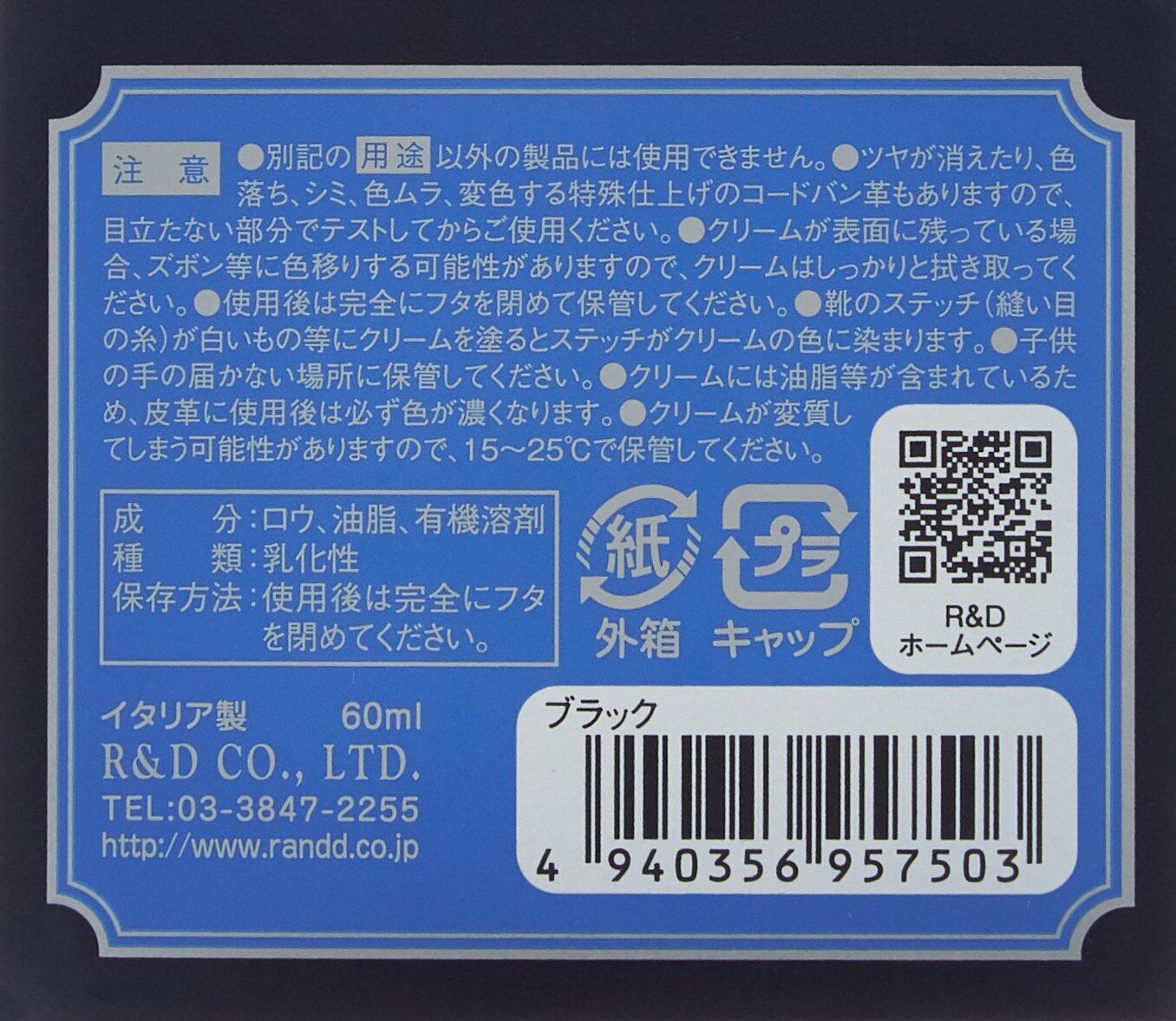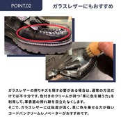 ・特殊なカラーワックス配合によりコードヴァンの色を鮮やかに蘇らせて補色します。・保革(栄養)効果や美しい光沢感を出すことでコードヴァンが本来放つツヤをしっかりと出します。着色力が強く革に色がうまく乗るので、ガラスレザー等の通常の乳化性クリームが浸透しにくい革の補色にもお使い頂けます。■用途:コードヴァン(コードバン)の補色・栄養・ツヤ出し、ガラスレザーの補色・ツヤ出し■タイプ:乳化性クリーム ガラスビン入り■容量:60ml ■原産国:イタリア製 ■カラー:全7色(ブラック・ニュートラル・Mブラウン・Dブラウン・Lブラウン・ネイビー・バーガンディ)■注意:用途以外の製品には使用できません。必ず目立たない部分でテストしてからご使用下さい。