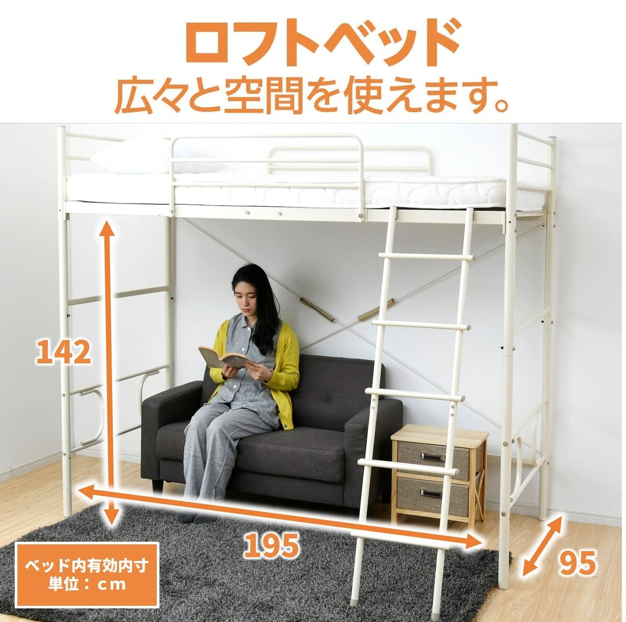●ベッド下有効寸法 : 幅196.5×高さ142cm(ハイタイプ)、幅196.5×高さ52.5cm(ロータイプ)