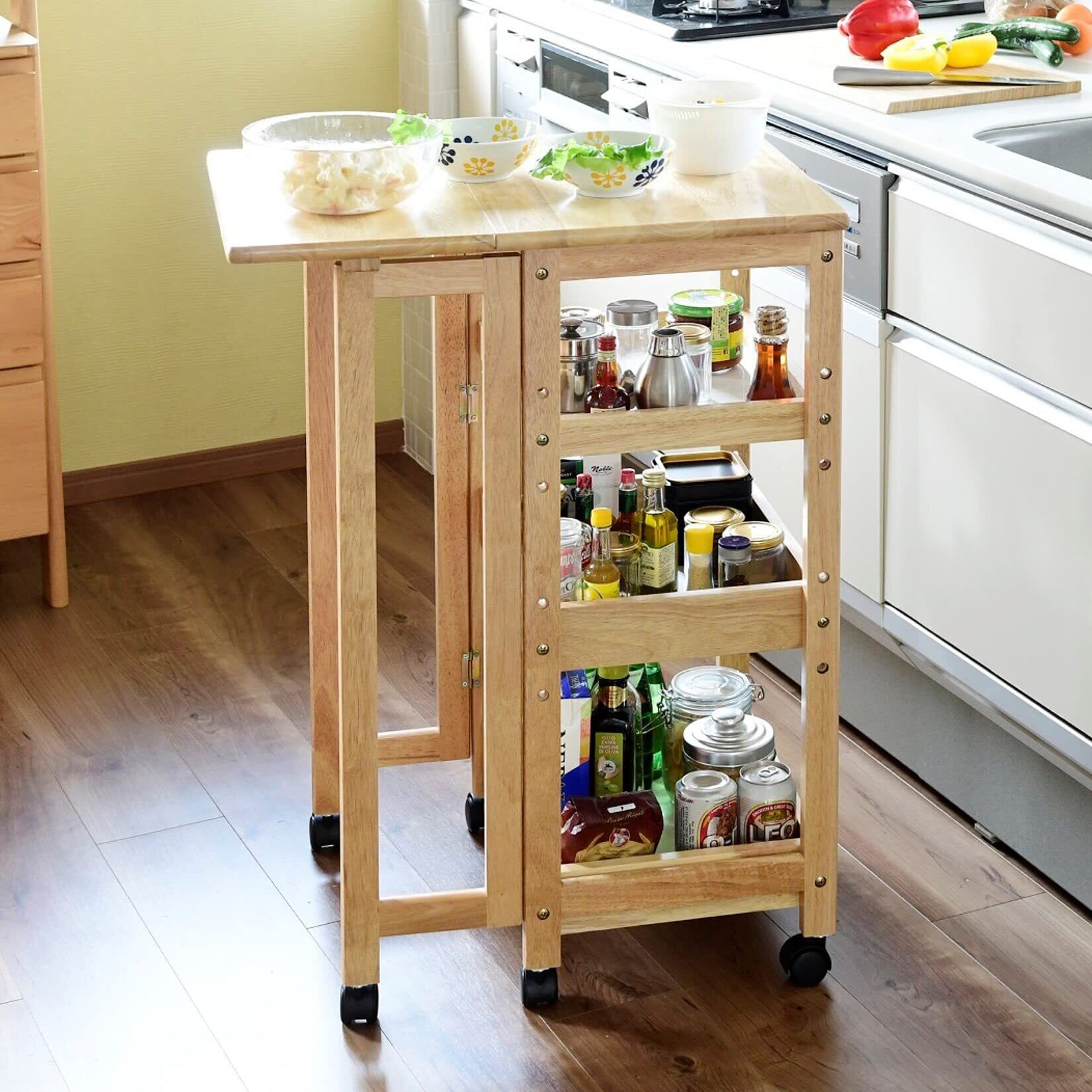 山善(YAMAZEN) ワゴン キャスター付き 3段 (折りたたみ) キッチン 作業台 幅45×奥行40/62×高さ85㎝ 棚板高さ調節 バタフライ テーブル 調味料ラック 組立品 天然木 ABW-8560(NA)