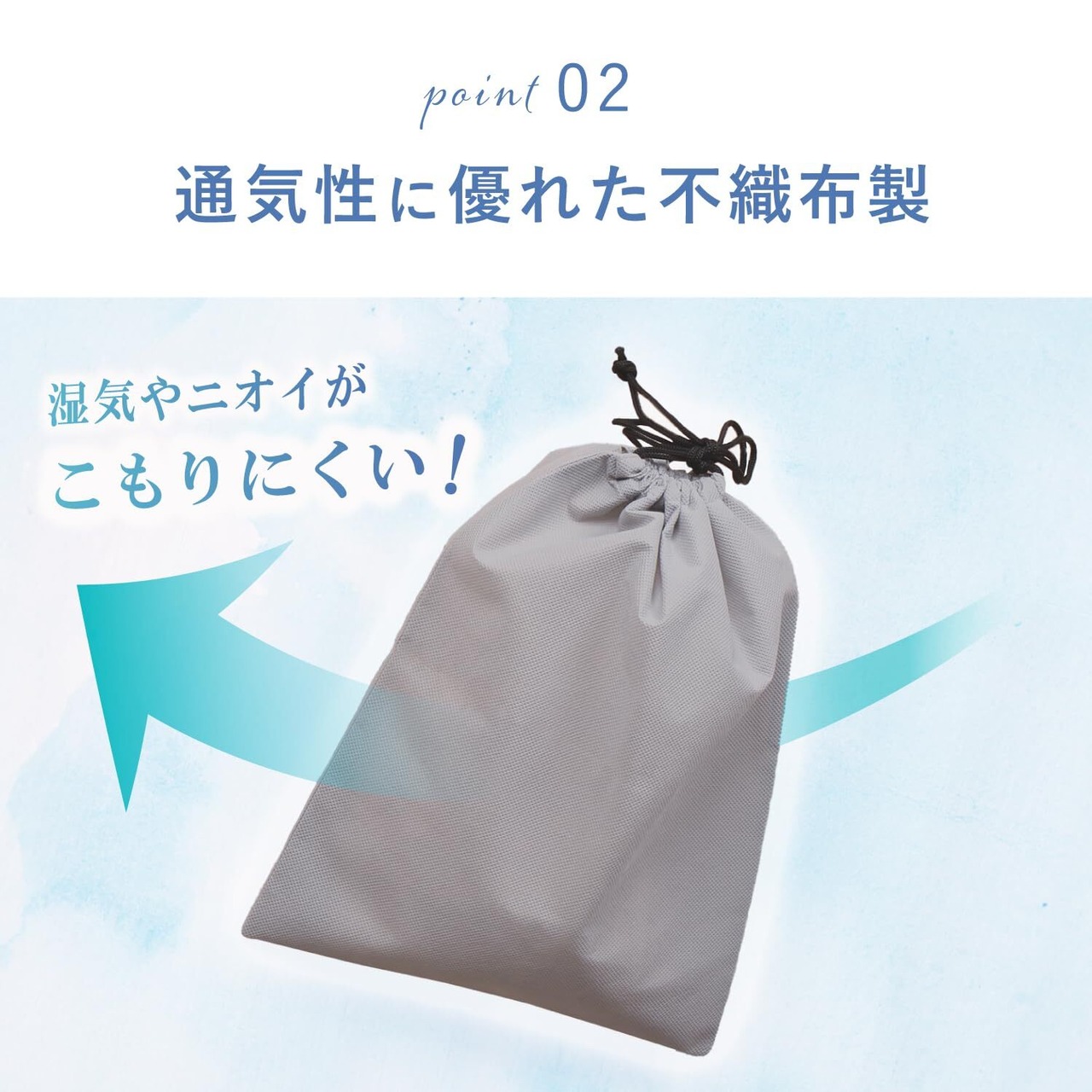 【通気性に優れた不織布製の靴収納巾着袋】:通気性の良い不織布製の袋で靴やスリッパなどを湿気やホコリから守り保管。
