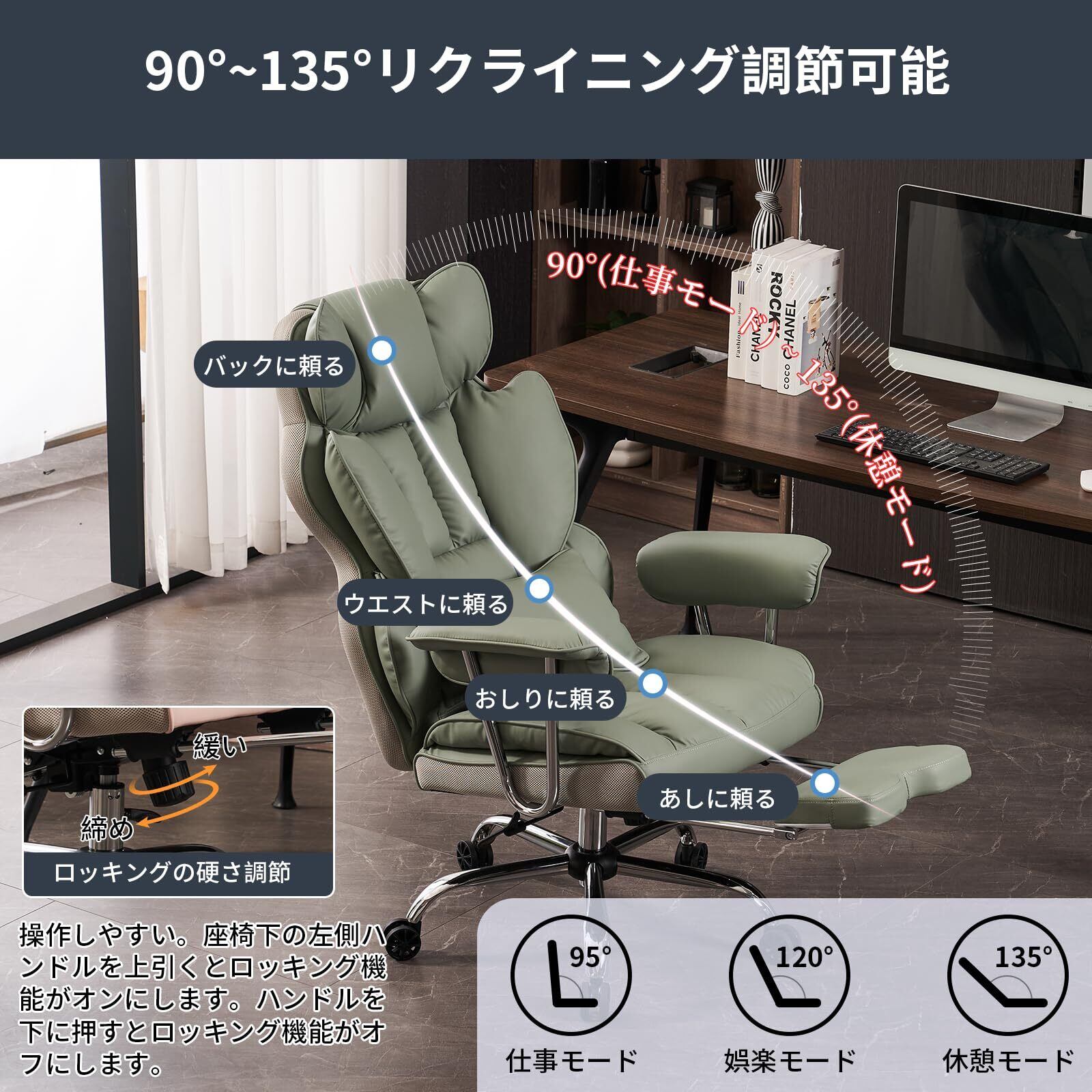 【90°−135°リクライニング&ロッキング機能】リクライニング角度はお好みまでに調節出来ます。疲れたリラックスしたい場合、すぐ休憩出来ます。緊張な仕事の合間、ロッキング機能をオンにして、体が椅子に付いて揺れて、リラックス出来てストレスを緩和し、仕事効率を高めます。
